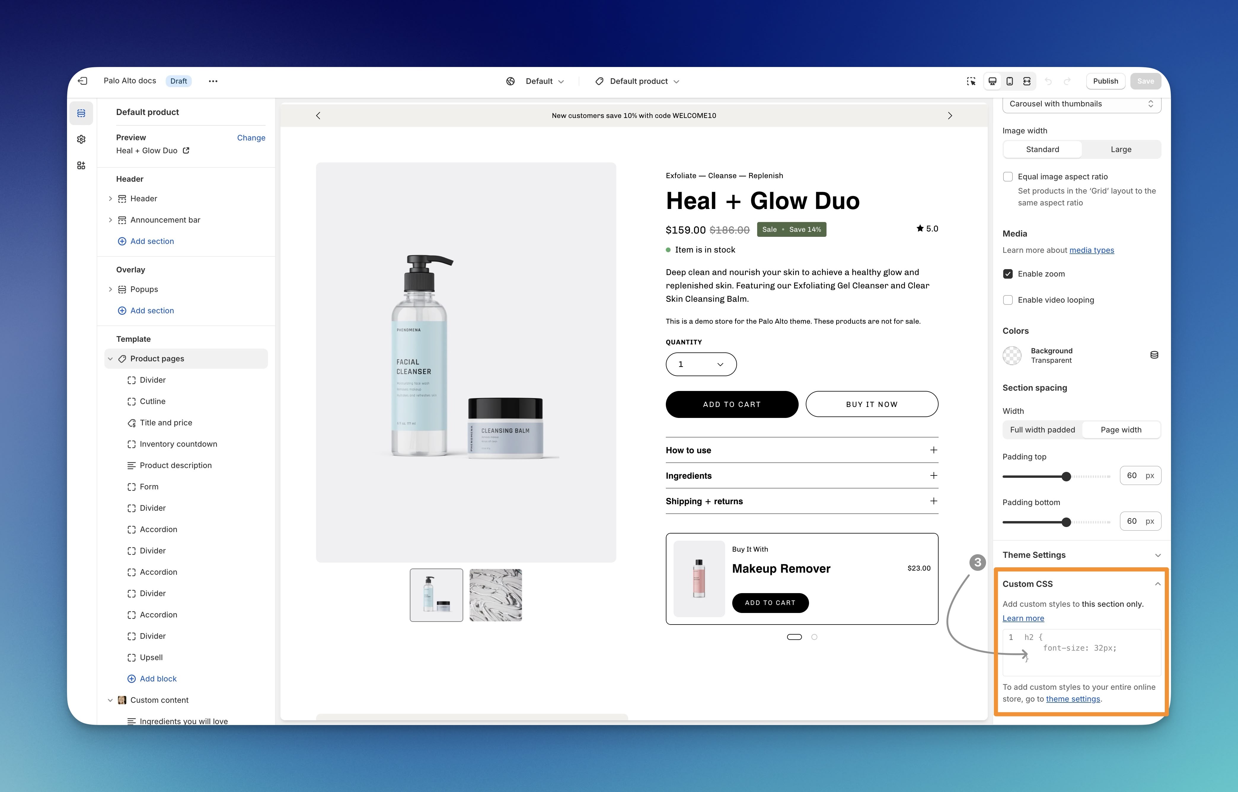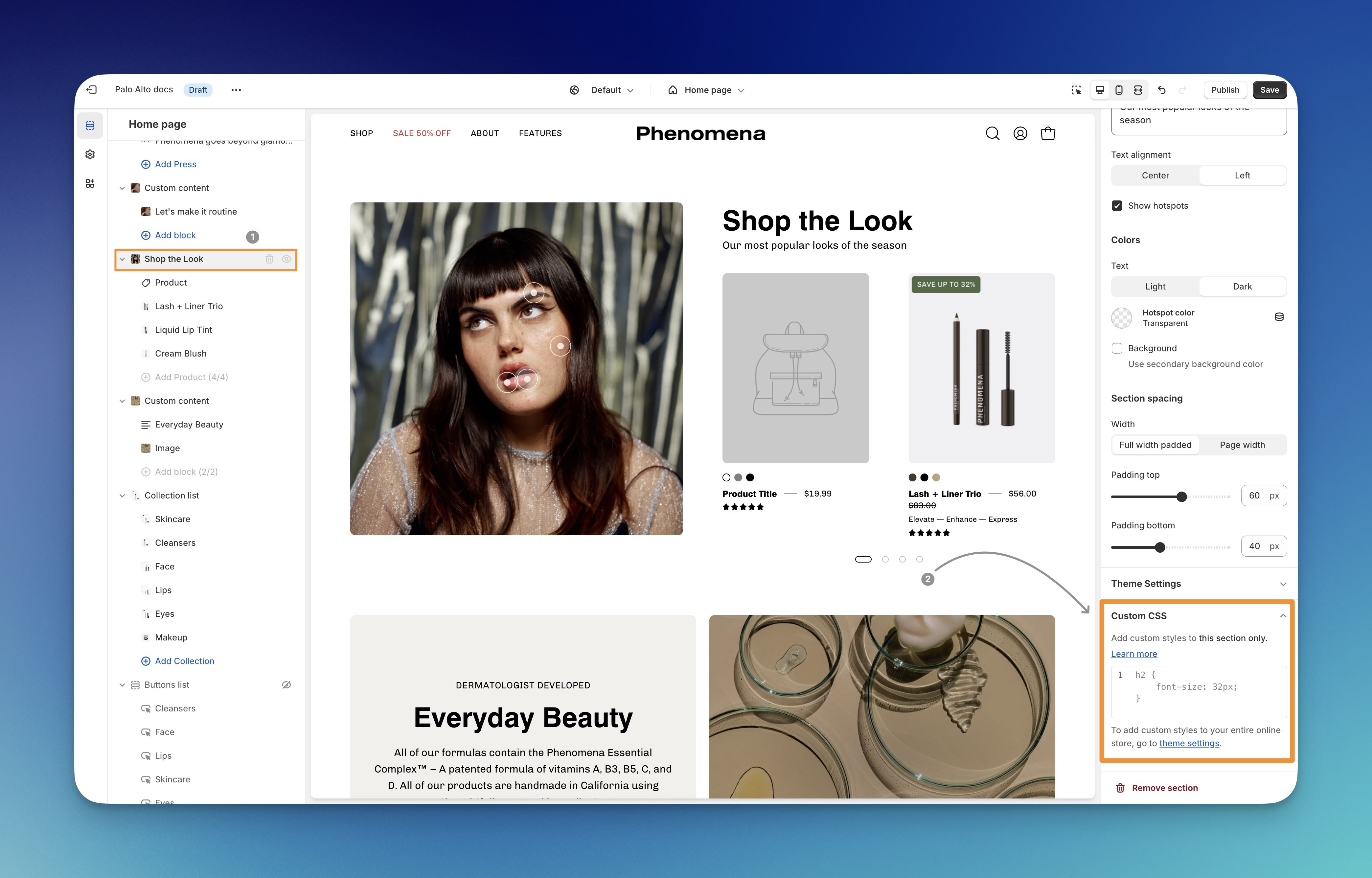 Sections - Customize elements only within a specific section. This includes the home page, header, cart drawer, and footer.
