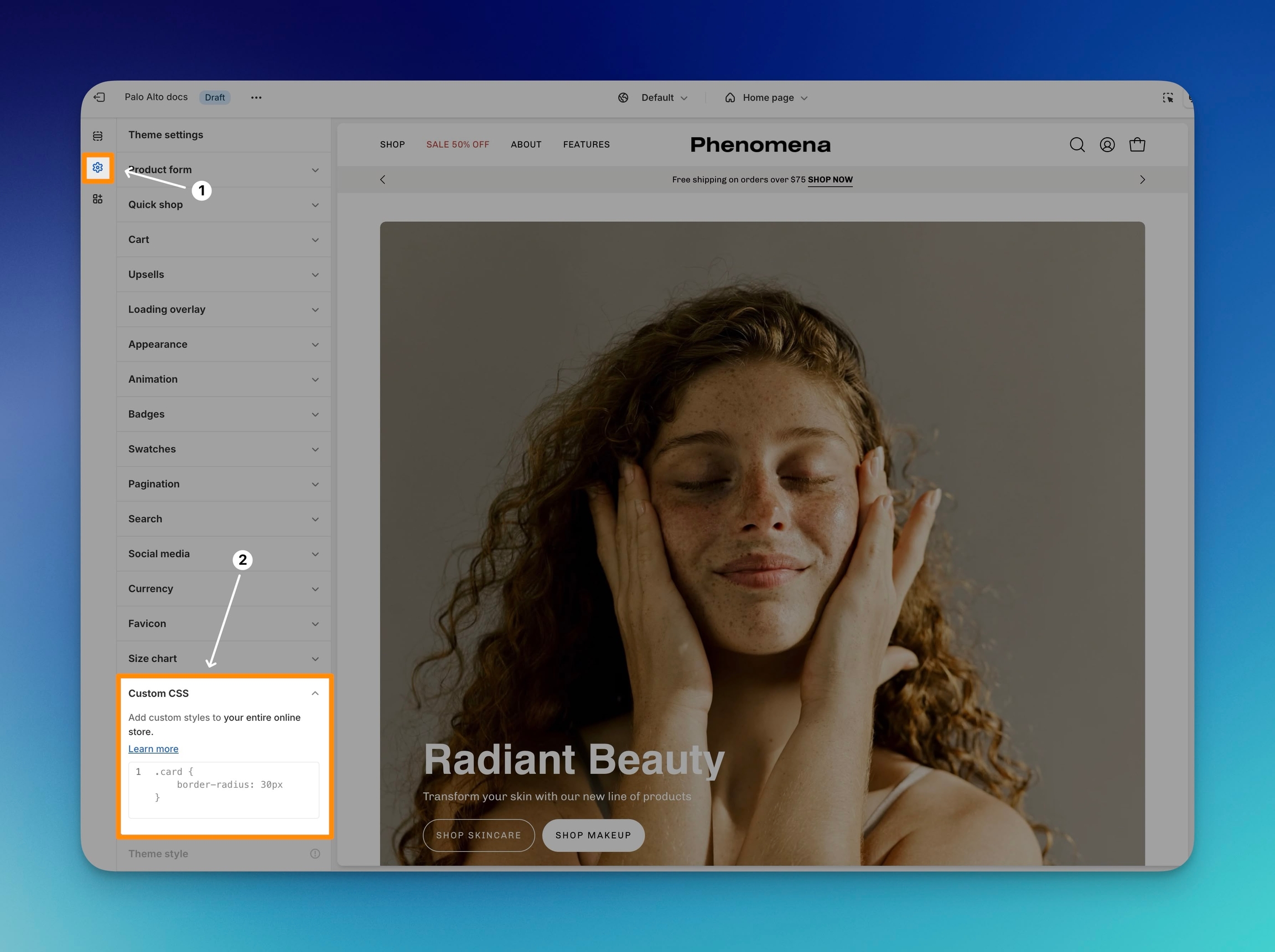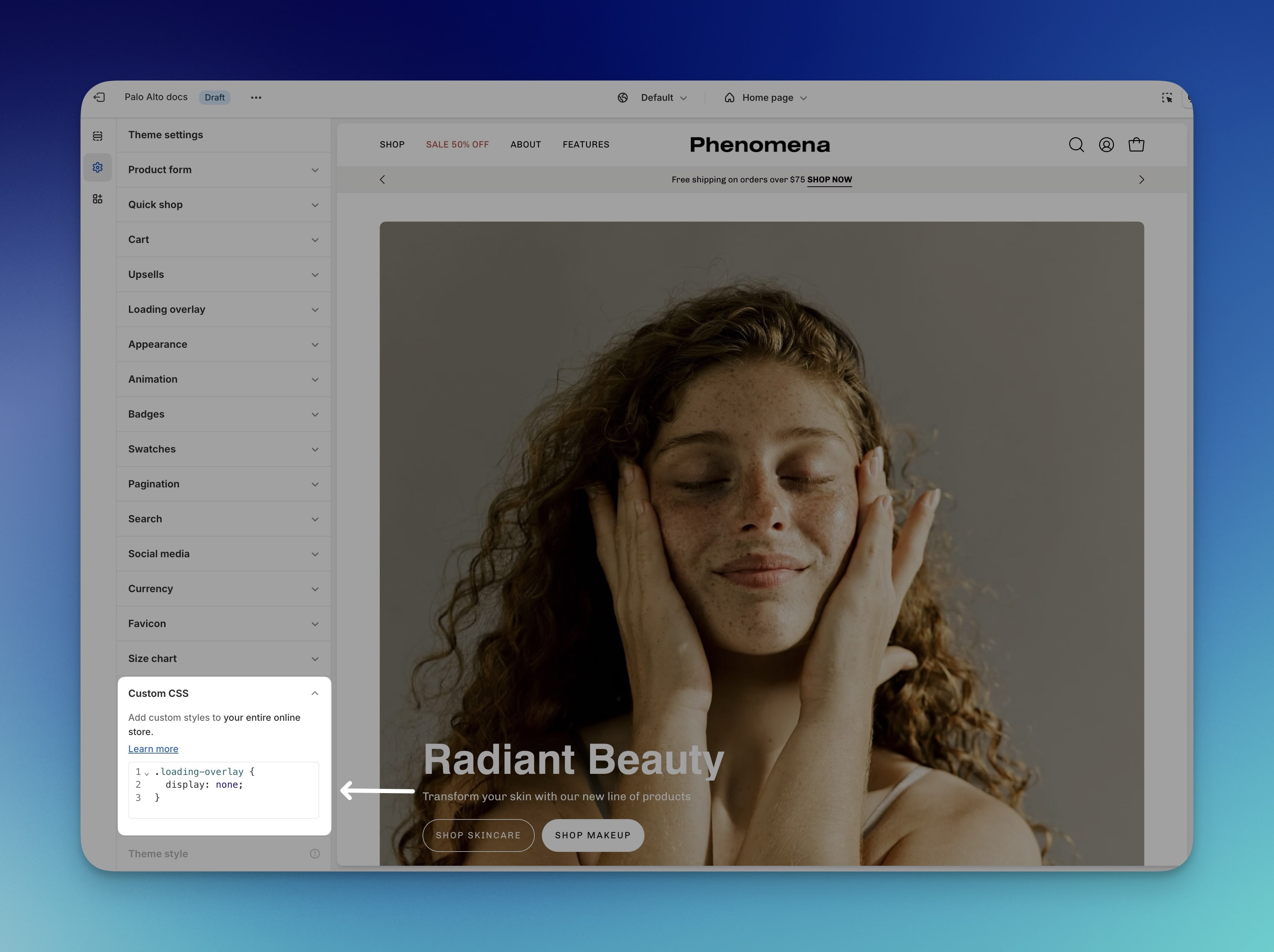 Shopify has made adding global and local CSS changes to your theme easy. Palo Alto supports these Theme Customer methods. Some examples are: