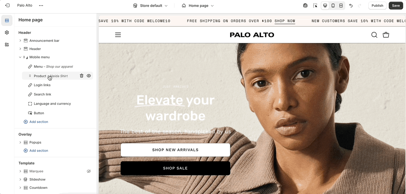 The **Product** block highlights a featured product inside the mobile menu. It can display the product’s image, name, and price, and can optionally be customized with your own image and layout settings. Ideal for promoting bestsellers, new arrivals, or limited-time offers.