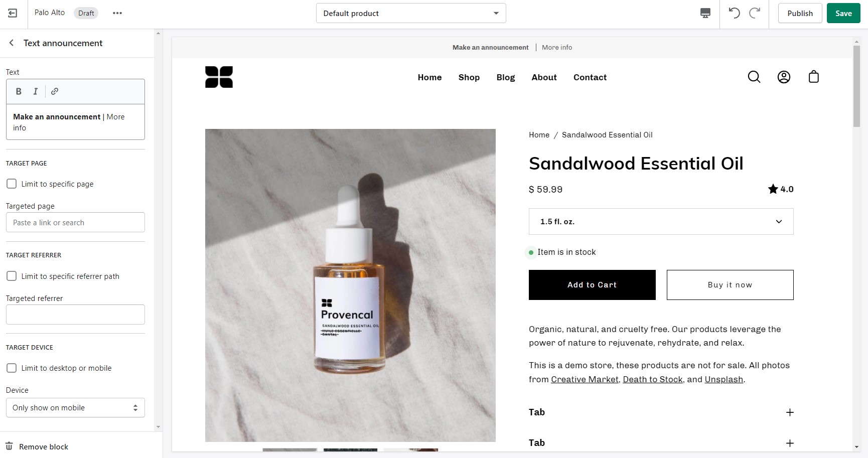 Display custom announcement messages to your customers only when the customer is browsing a certain page, product, collection, or blog post on your site. Target your message based on where customers are browsing on your site: