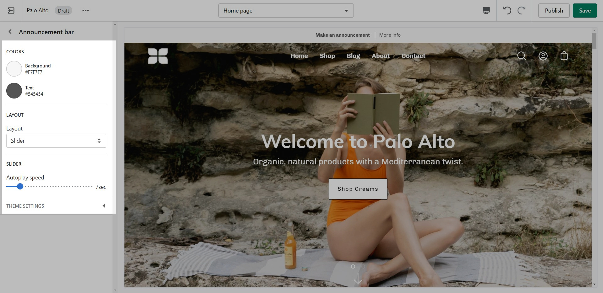 These settings will allow you to change the background and text colors of your Announcement bar section, layout style, and autoplay speed.