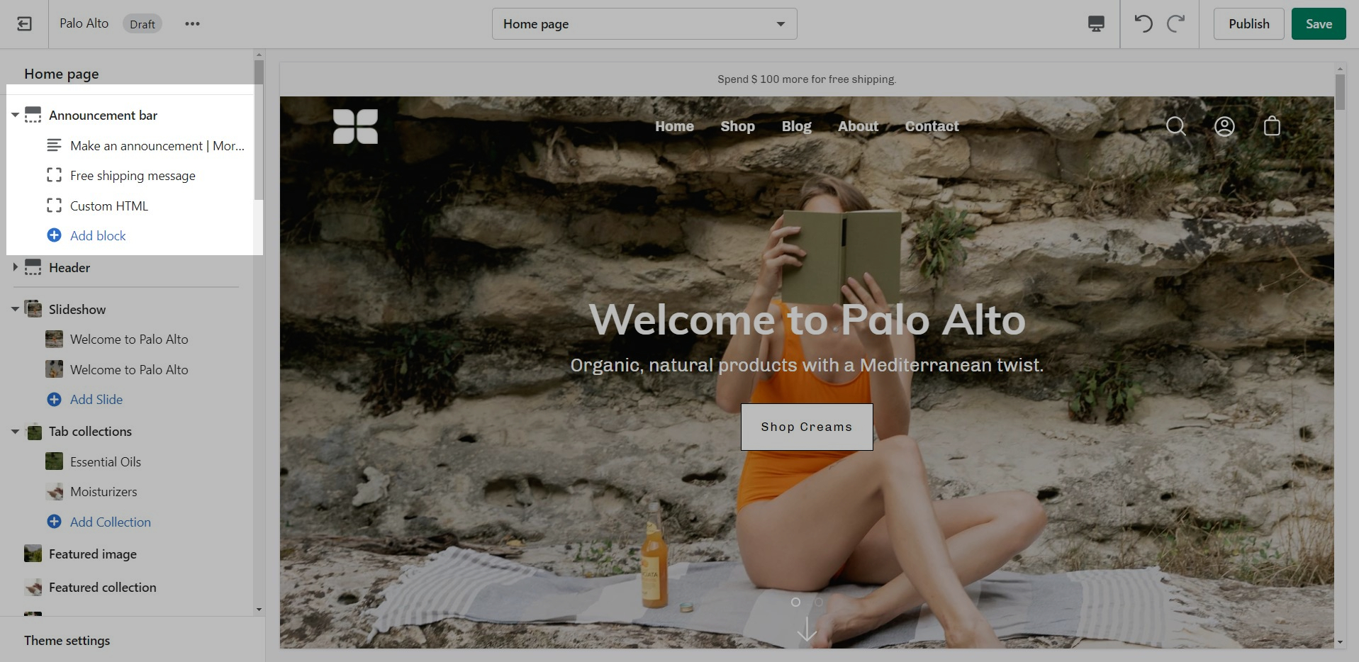 Click on the Announcement bar section to reveal the section settings.