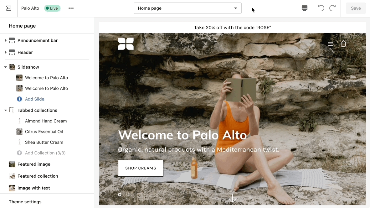 Palo Alto comes complete with 20+ professional theme sections to help you merchandise your online store. Sections can be added to any page on your store.