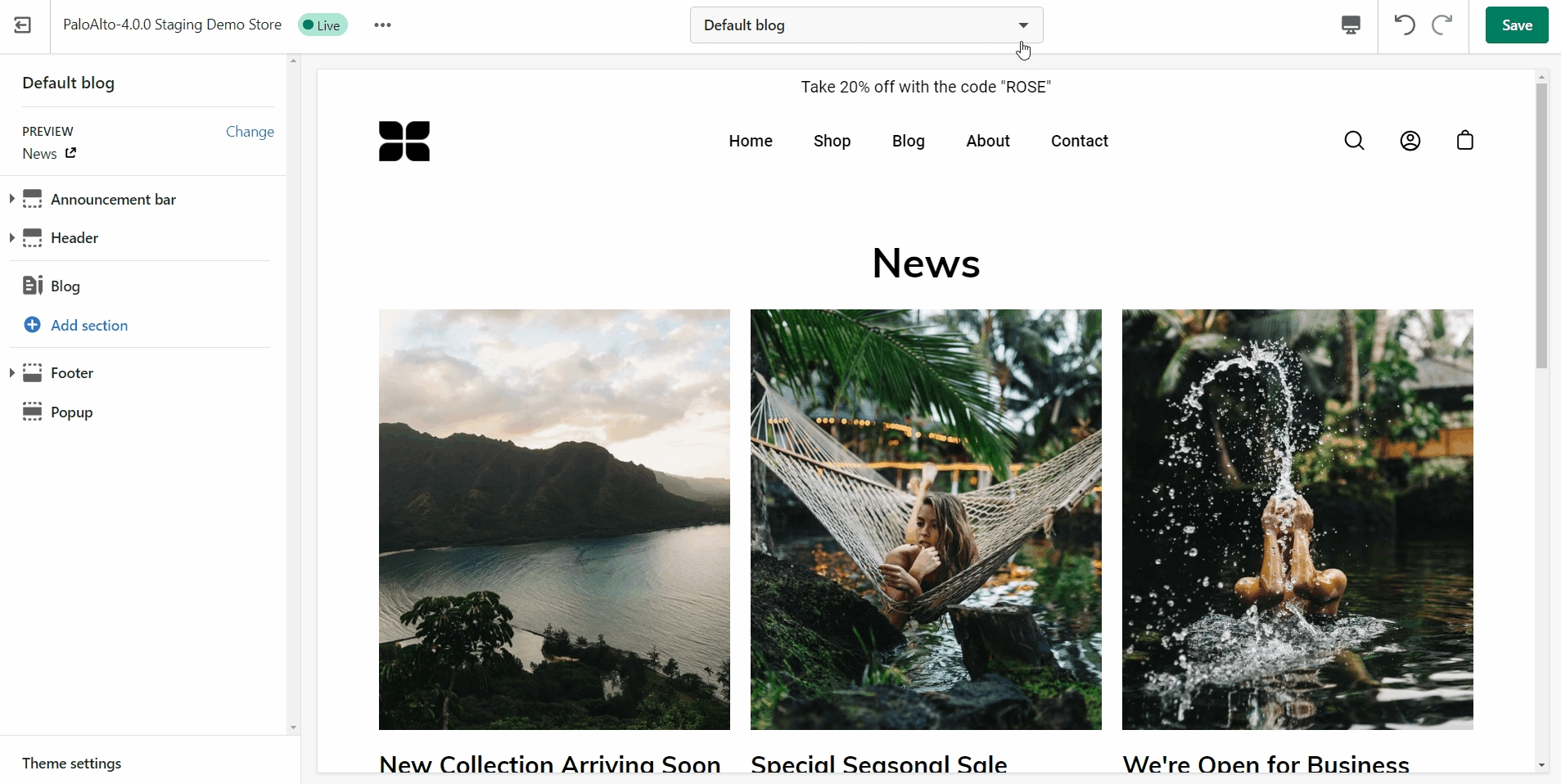 Find your new template by going into the same Blogs tab in the top drop-down menu and select the template you just created. You are now able to add sections to it without affecting any other blog template.