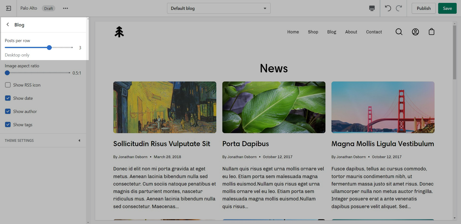 Palo Alto displays a rich grid of all your blog post articles. Click on Blog pages to configure the layout of your blog index page.