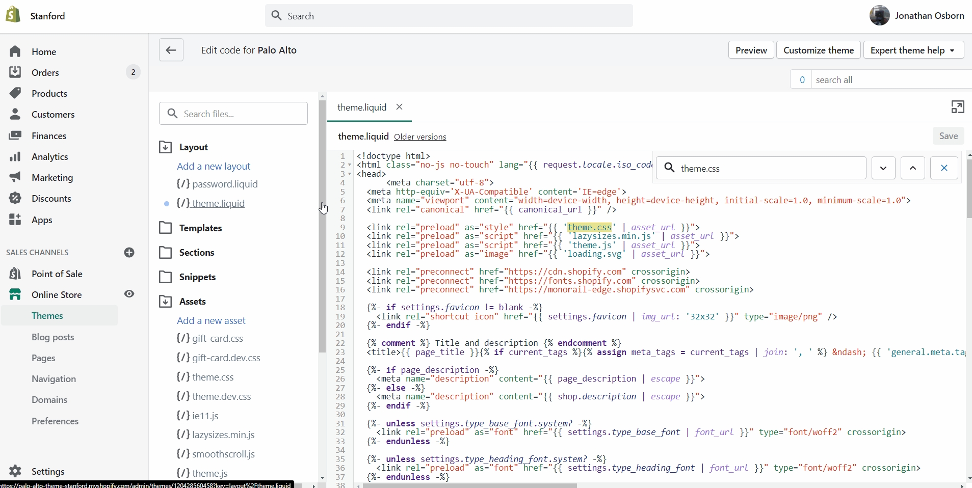 Click on the ellipses (three dots) icon at the top of the Theme Editor to view theme actions, choose Edit code.