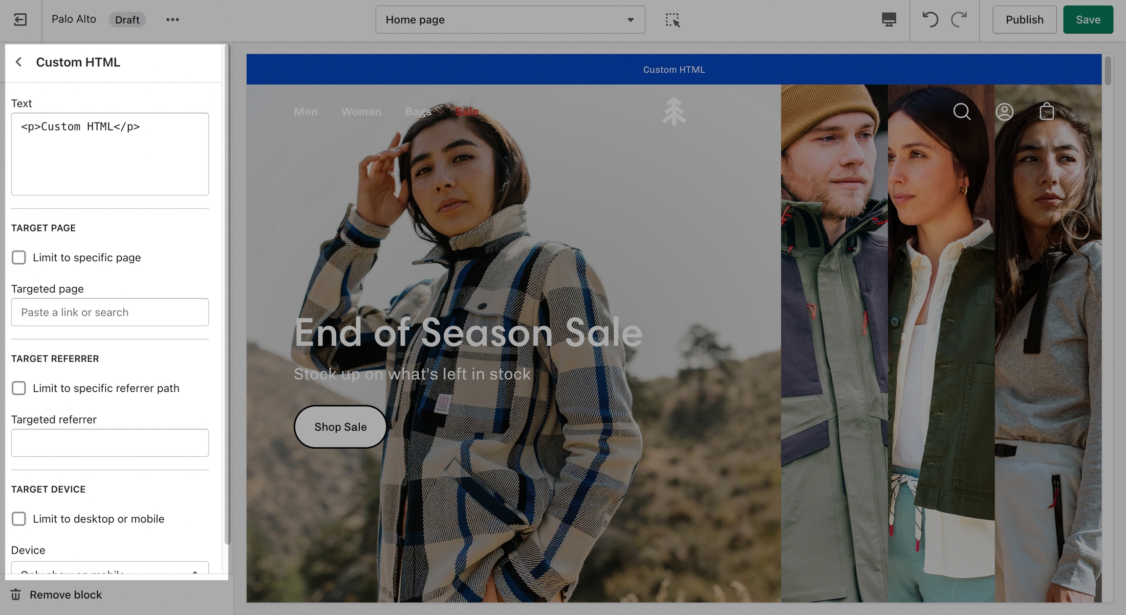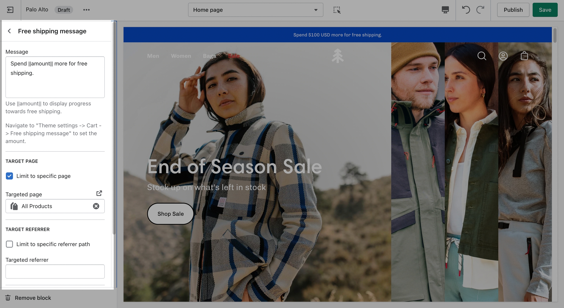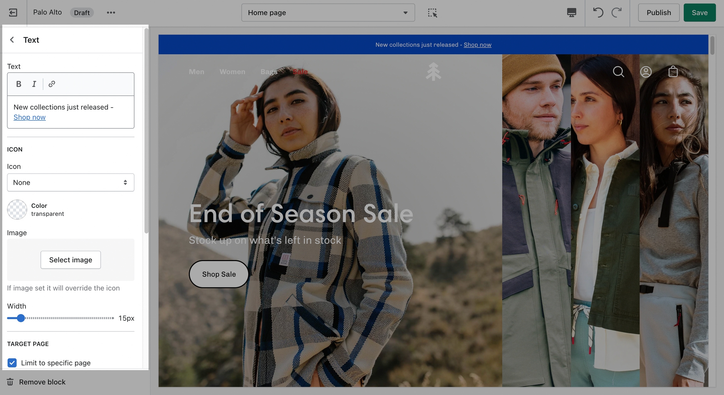 Display custom announcement messages to your customers only when the customer is browsing a certain page, product, collection, or blog post on your site. Target your message based on where customers are browsing on your site:
