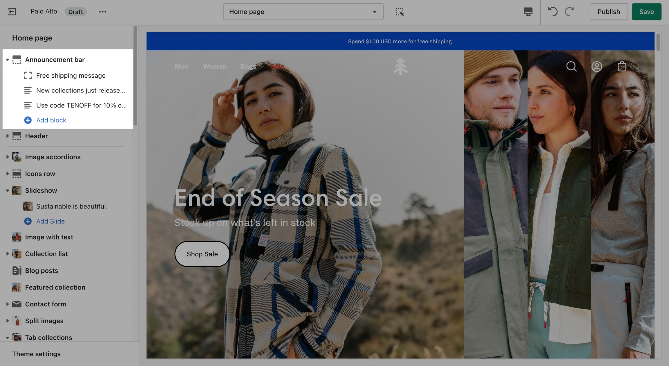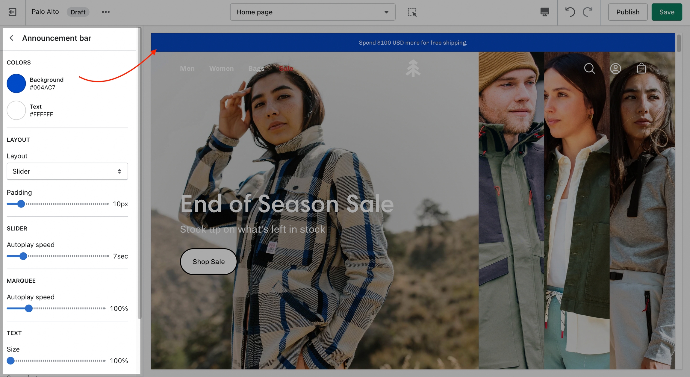 These settings will allow you to change the background and text colors of your Announcement bar section, layout style, and autoplay speed.