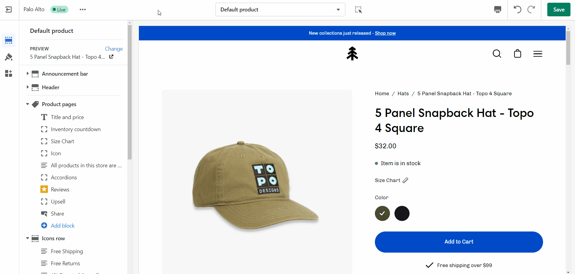 Palo Alto includes quick and easy settings in the Theme Editor to display ratings. The main requirement is that you have the Shopify Reviews app installed: