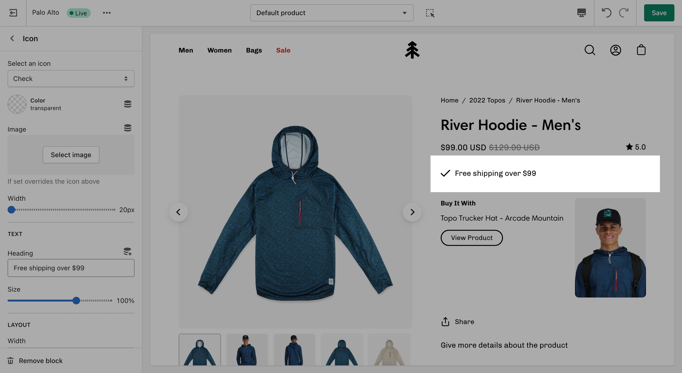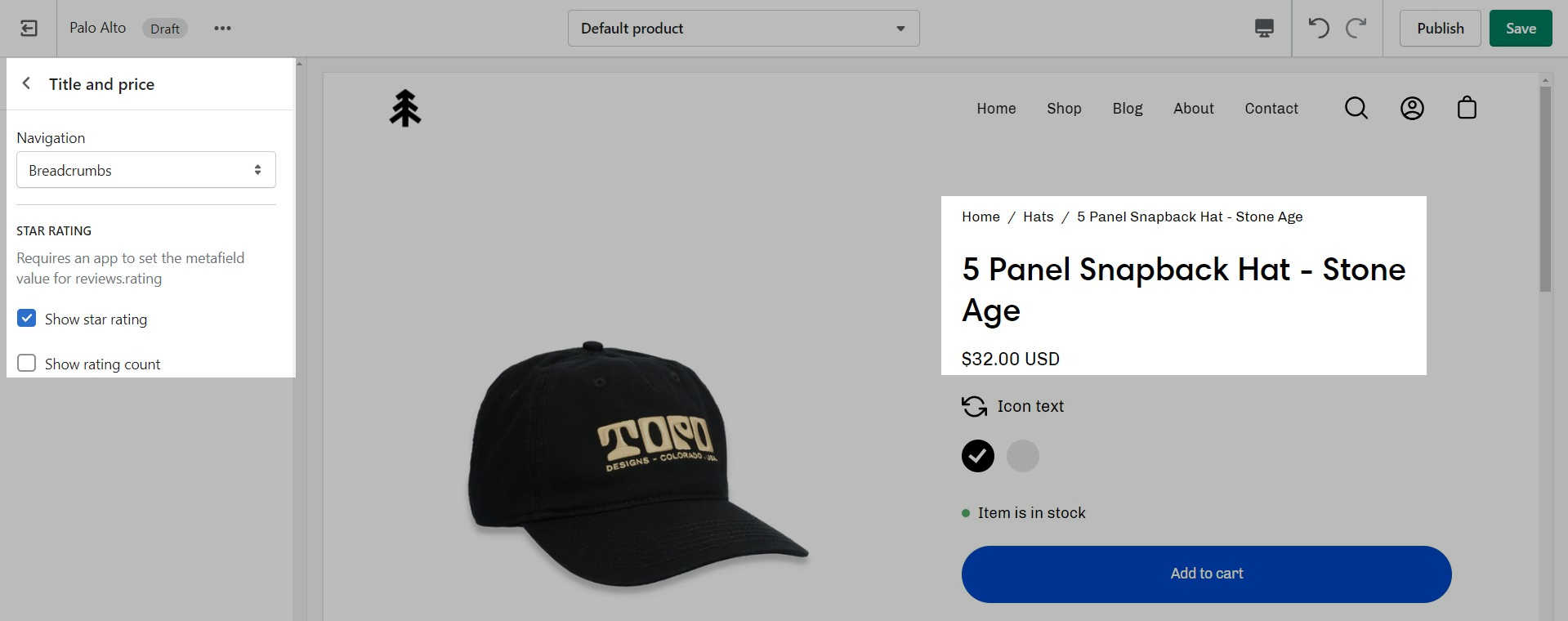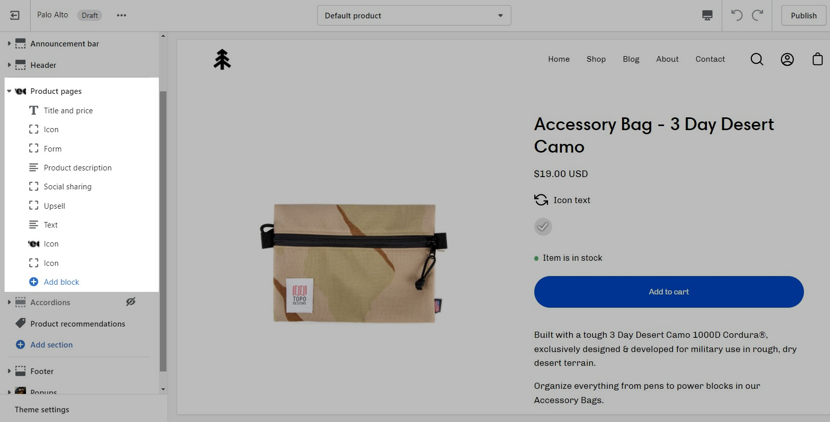 The Palo Alto 'Product pages' section blocks help you customize the primary or core content for your product pages and product templates. Adding sections further enhances your merchandising.