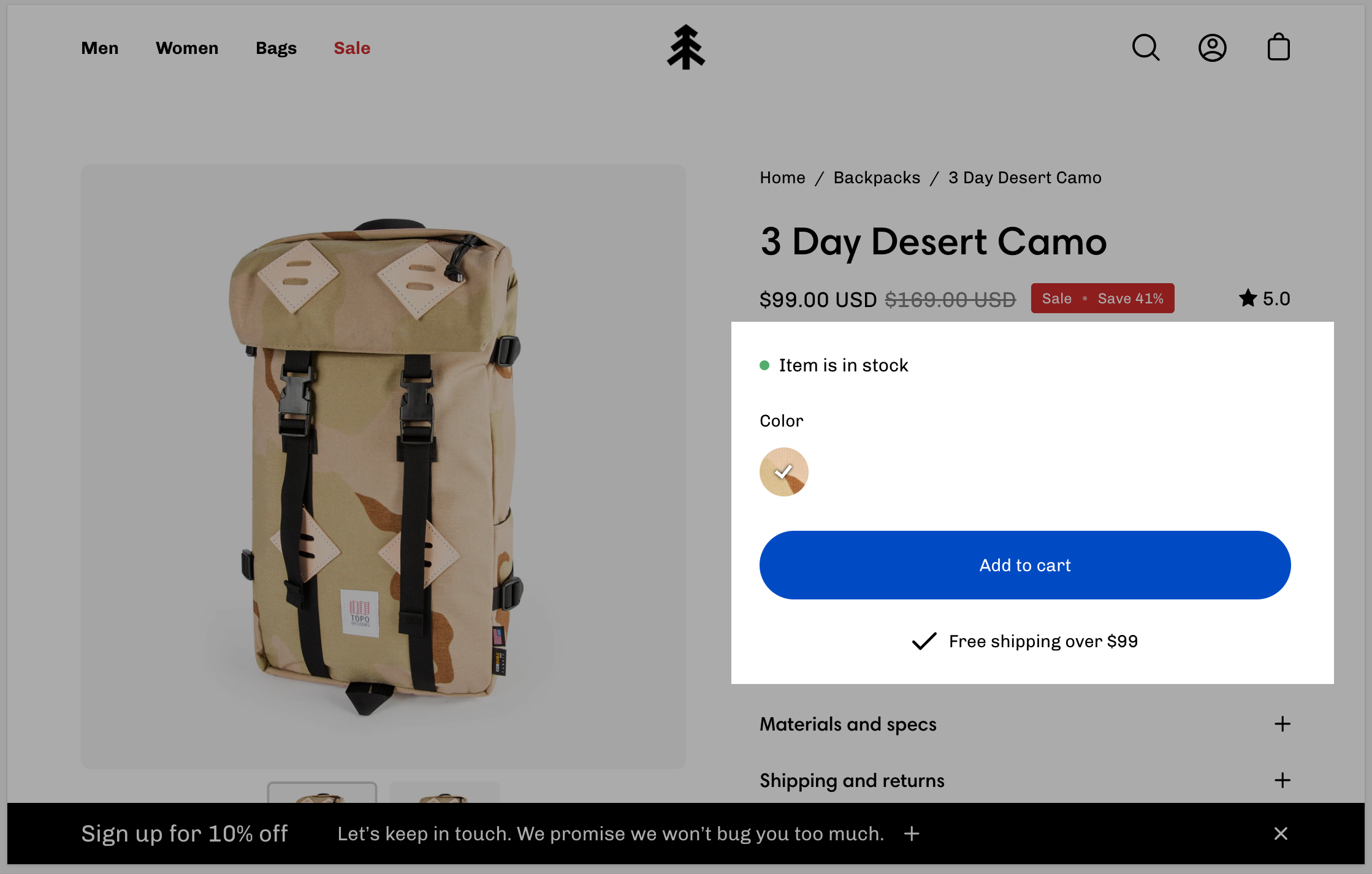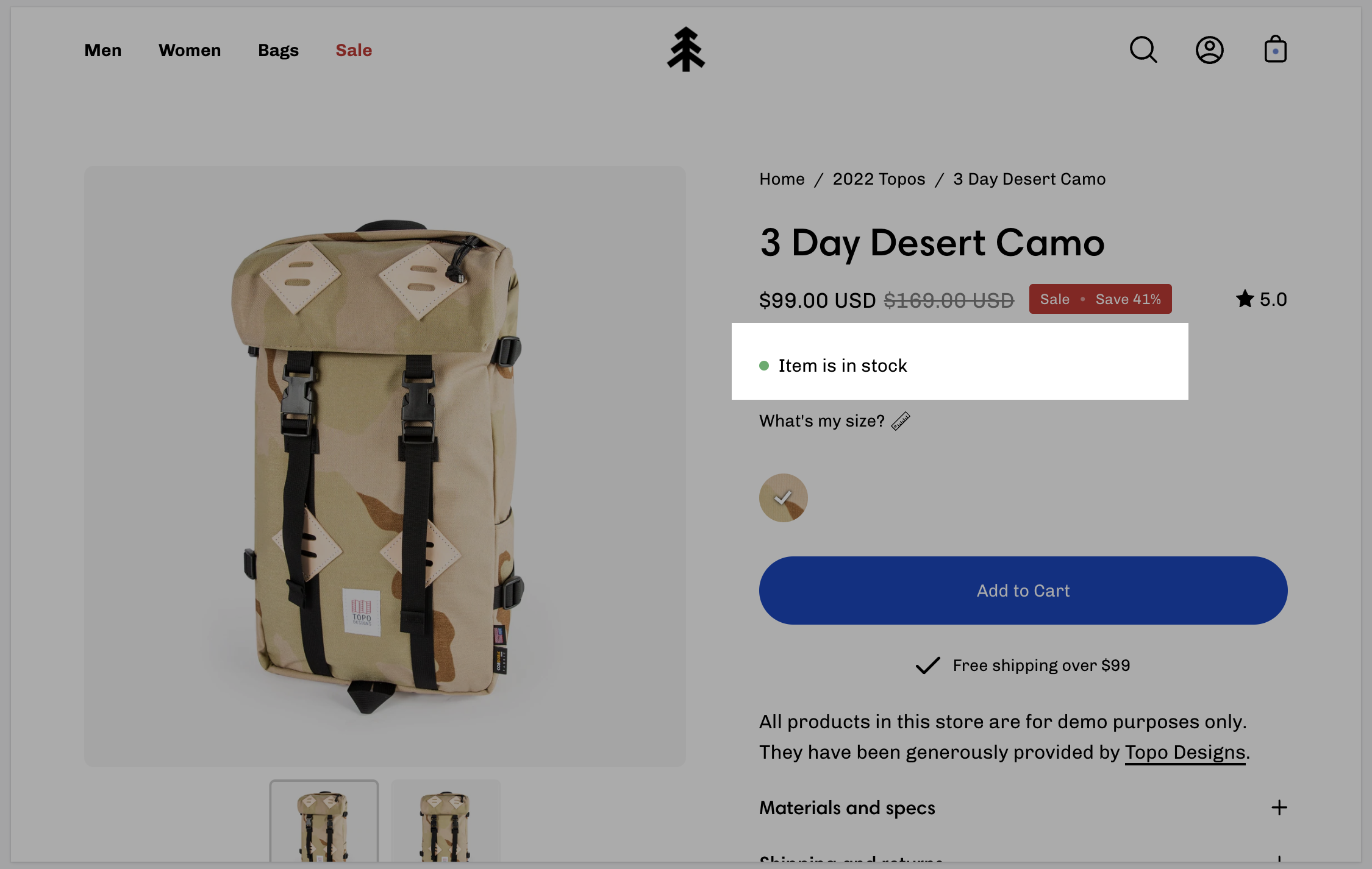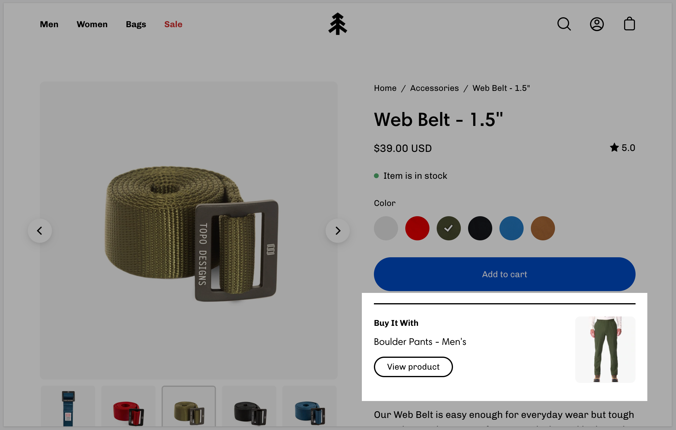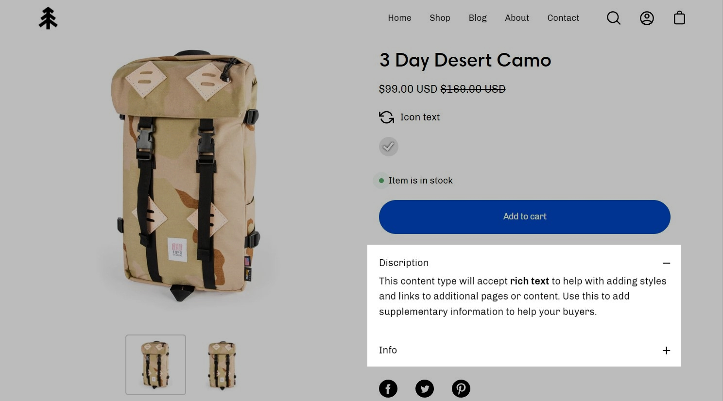 The Palo Alto 'Product pages' section blocks help you customize the primary or core content for your product pages and product templates. Adding sections further enhances your merchandising.