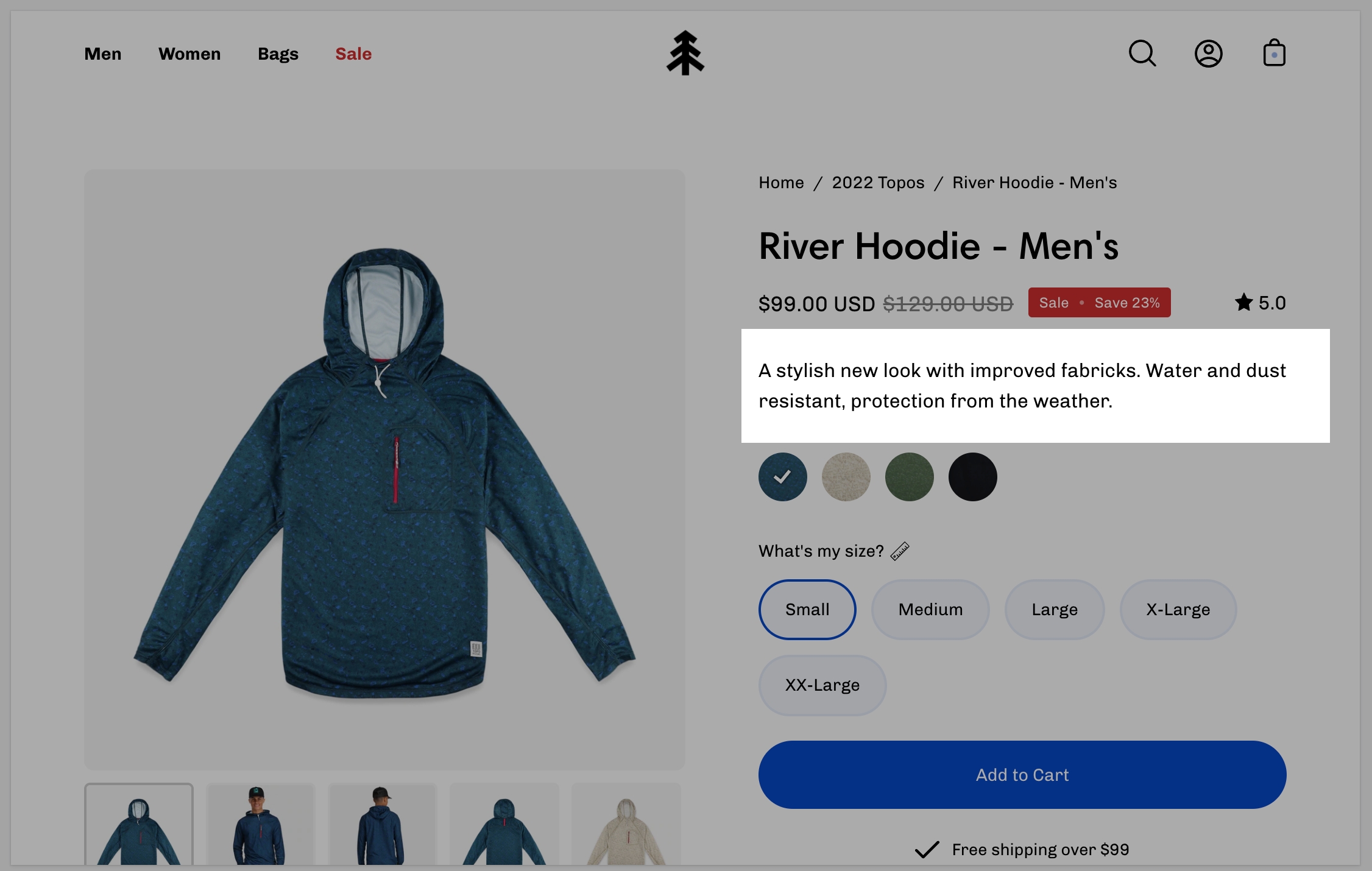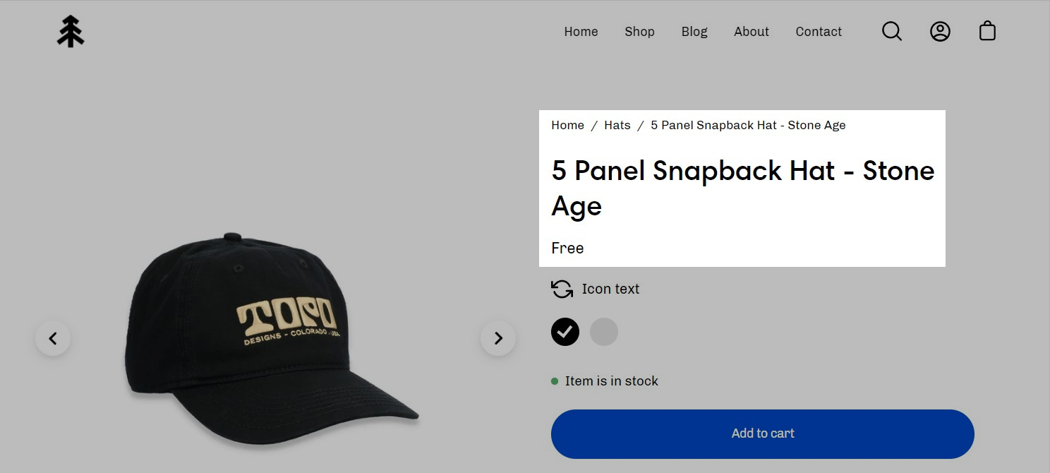Displays product price, title, and star rating when using the Shopify Ratings app. Includes an option to display Navigation breadcrumb above the title (including vendor option, see settings)
