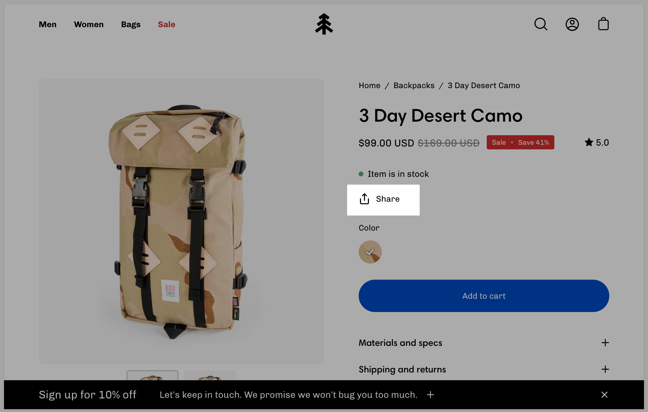 Displays a share icon for sharing current product page on social platforms or link to send.
