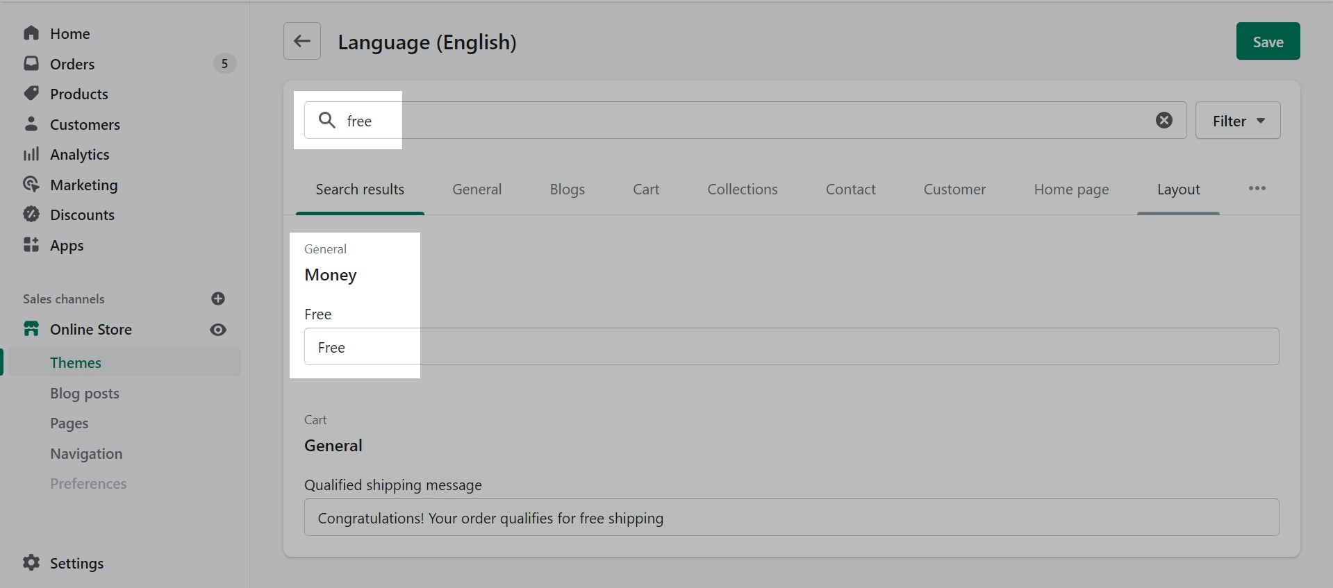 Search for free in the Filter bar and edit the field under General > Money > Free: