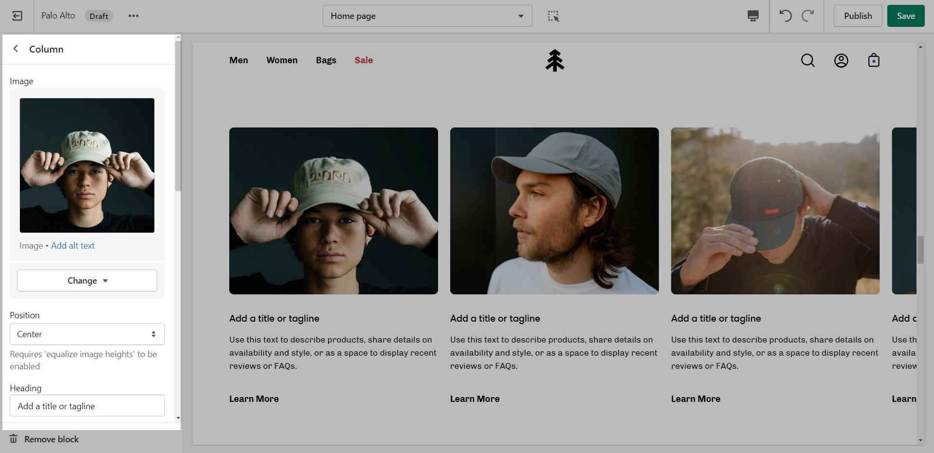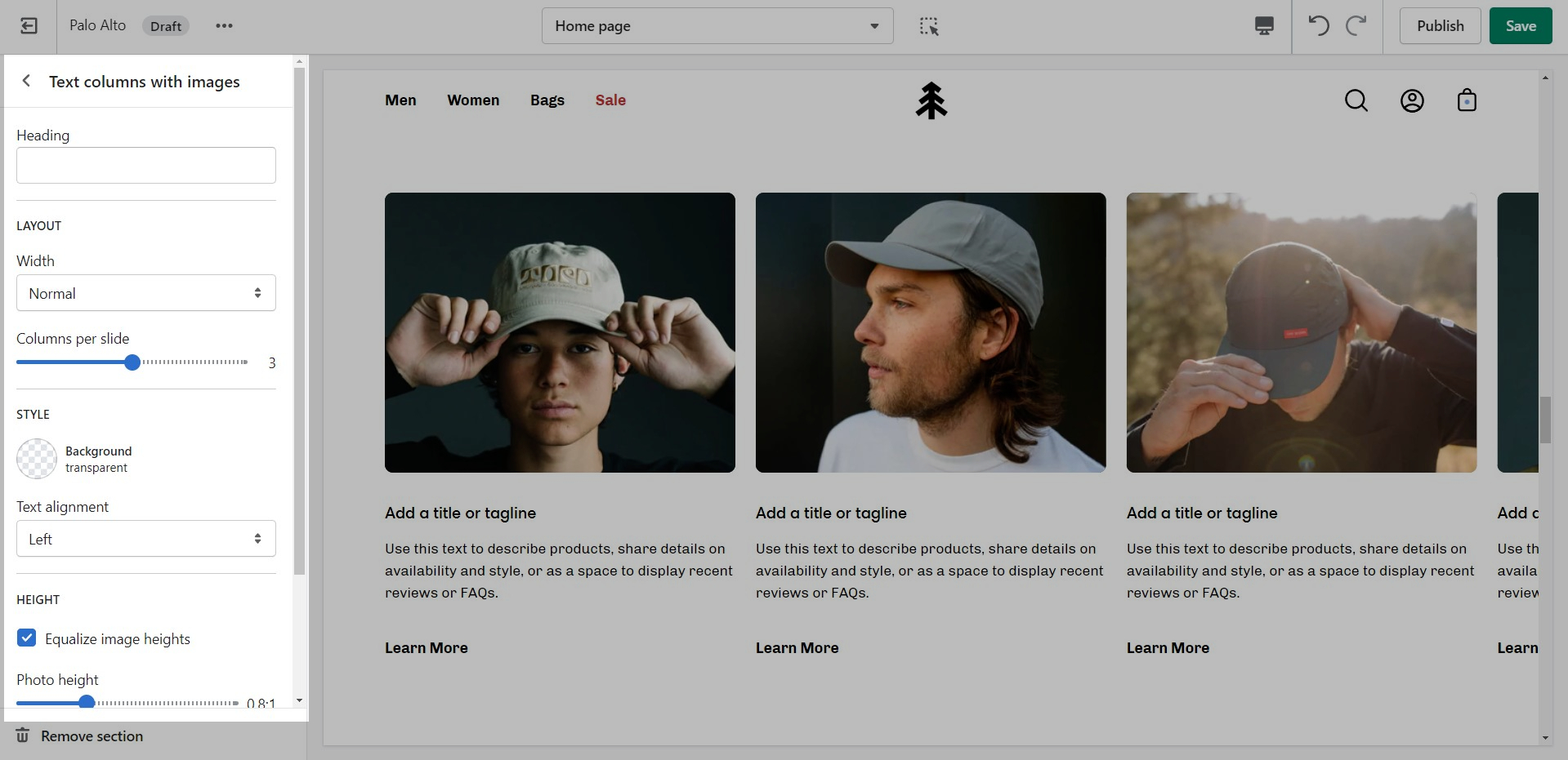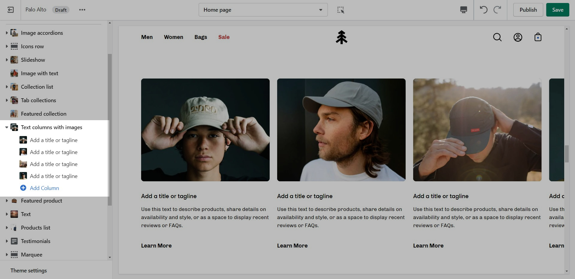 Inspired by the blog posts section, 'Text collums' allows you to create your own highlights from the theme editor without having the need to create blog posts.