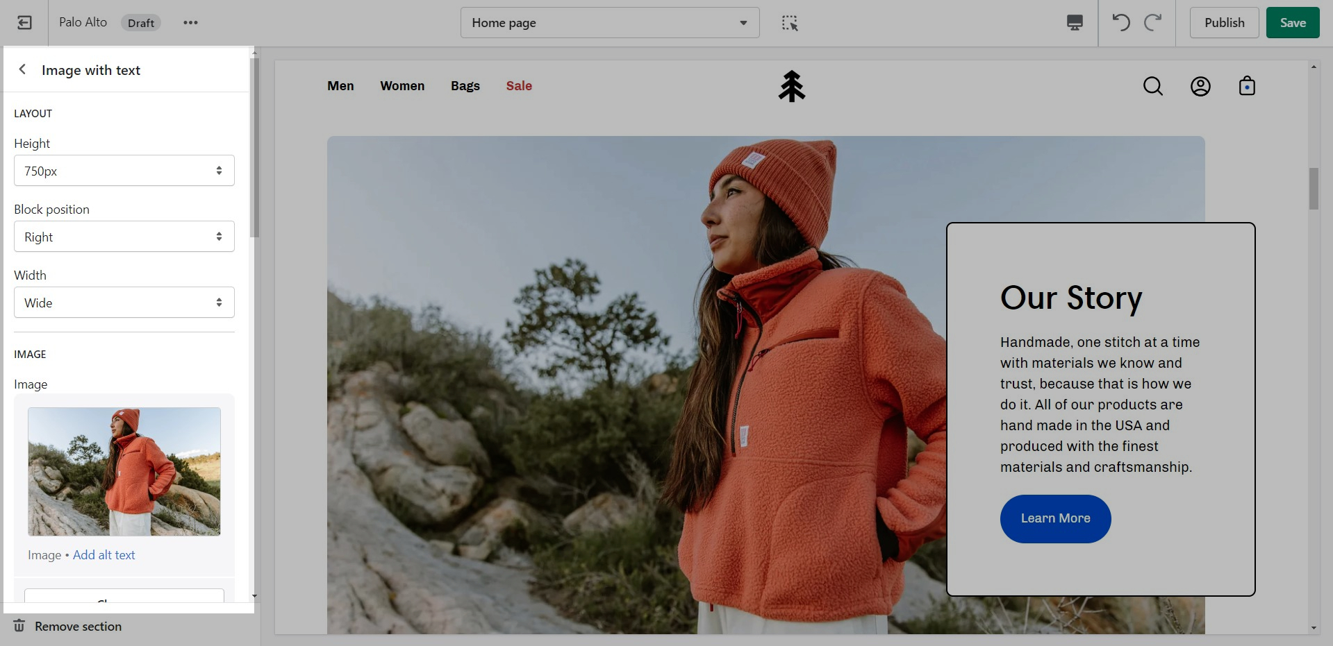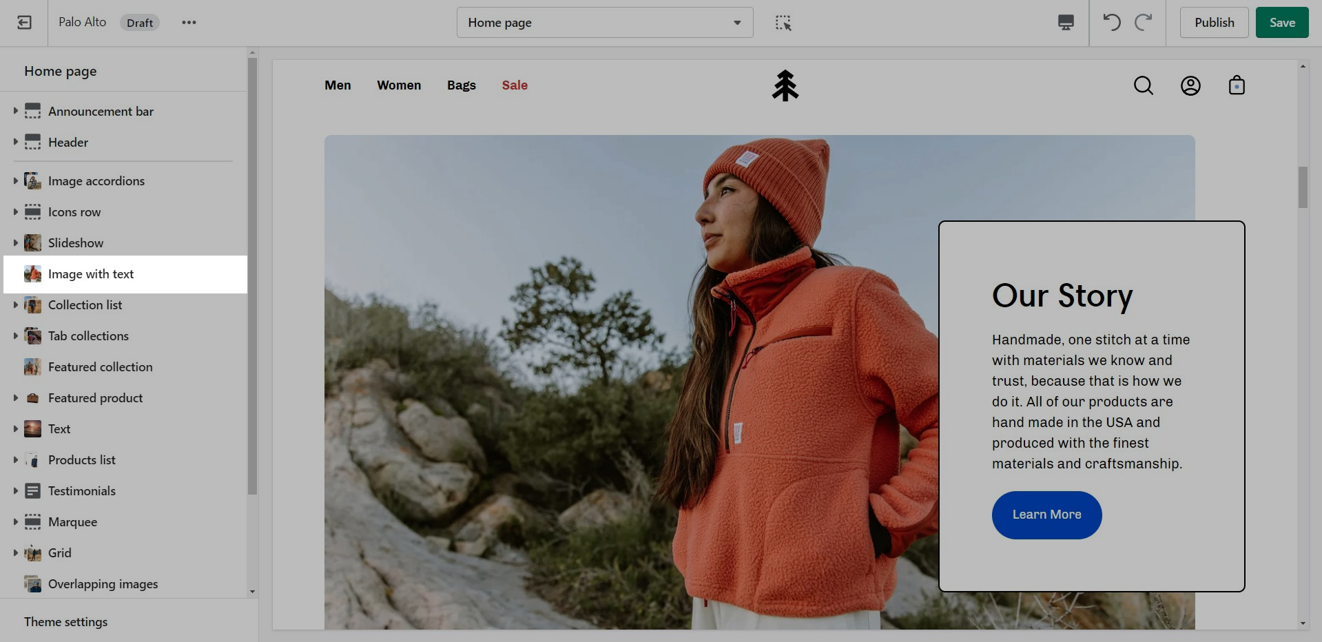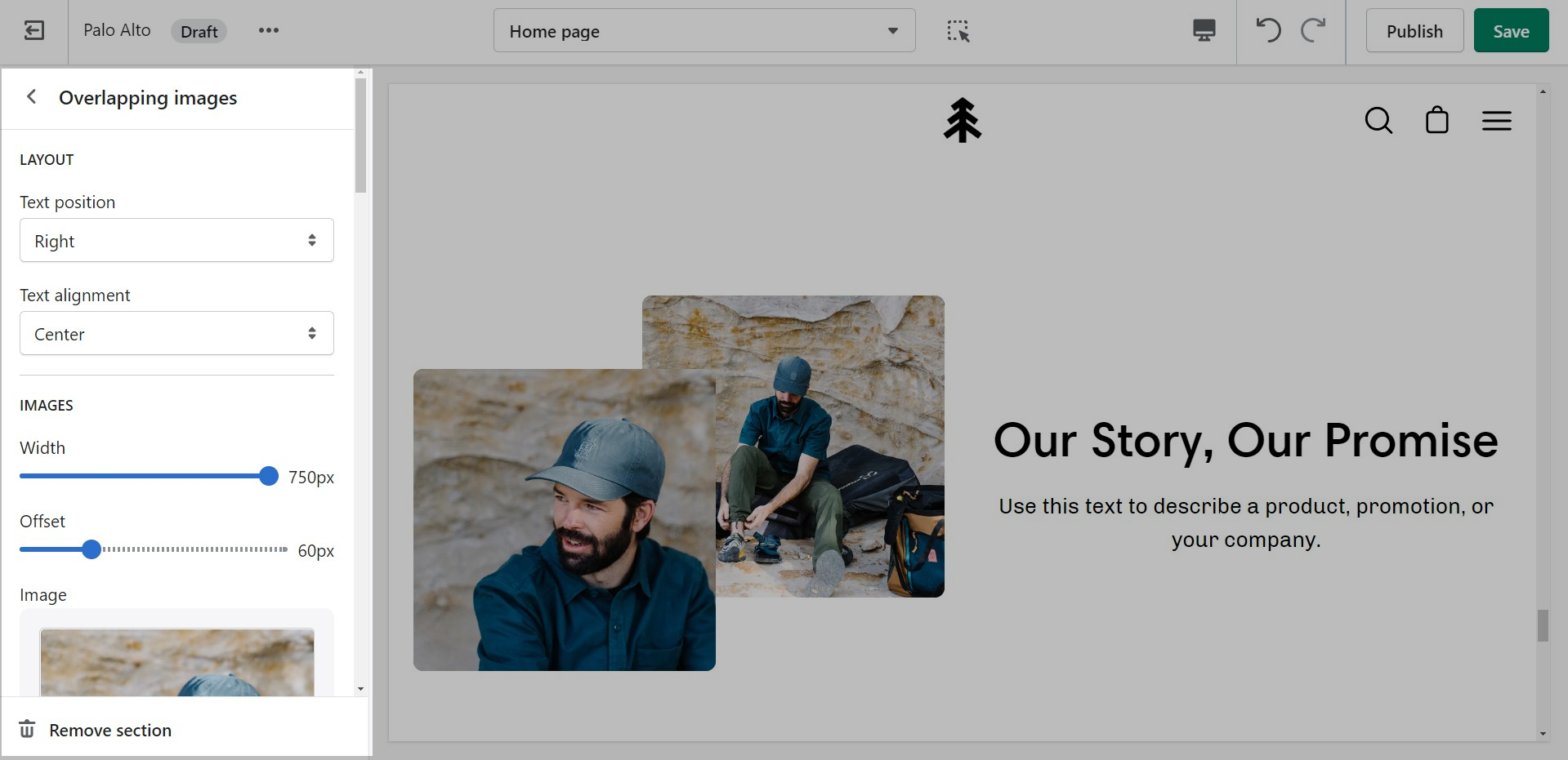 Inspired by the blog posts section, 'Text collums' allows you to create your own highlights from the theme editor without having the need to create blog posts.