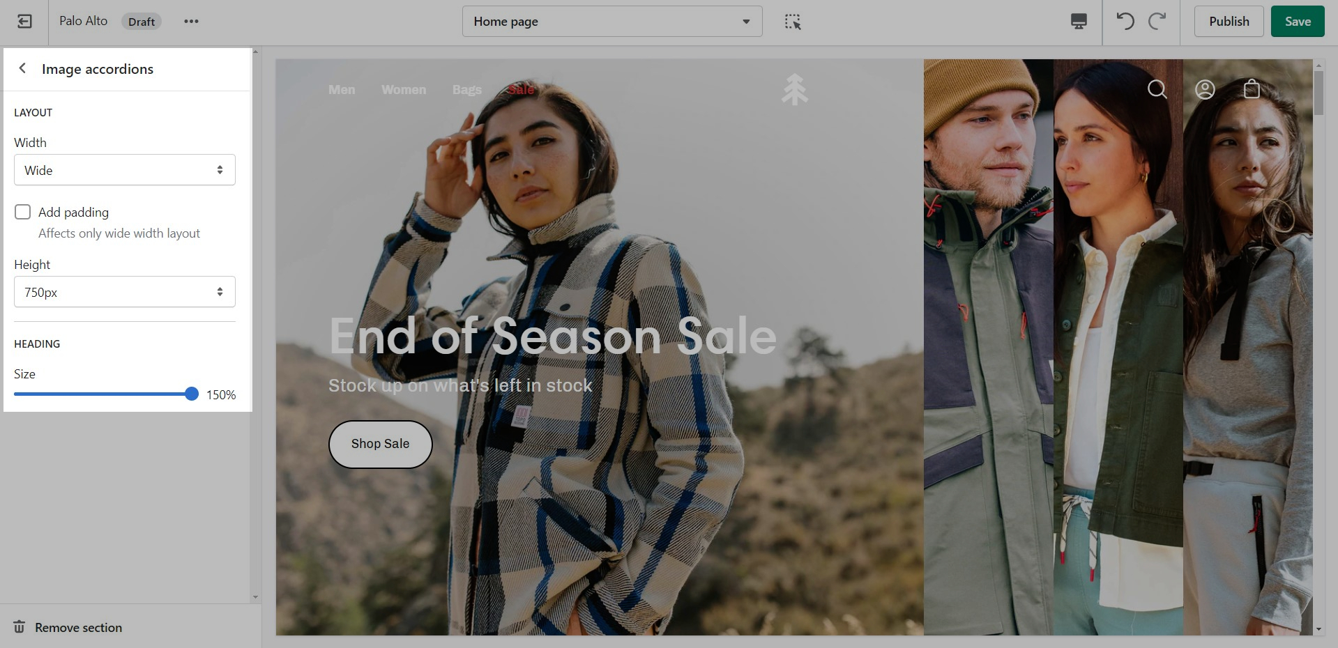 One of our newest sections, Image accordions, allows you to set a unique look and showcase multiple images that reveal more information as you hover over them.