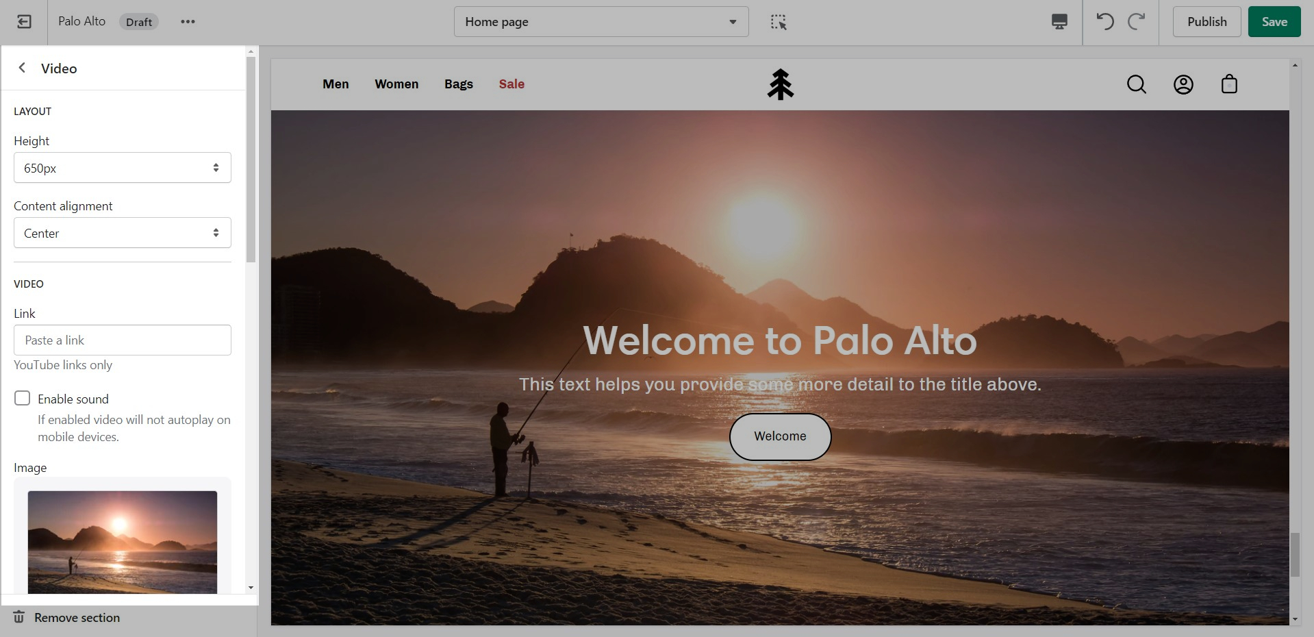 Set a YouTube or Vimeo link and regulate the size of your video section.