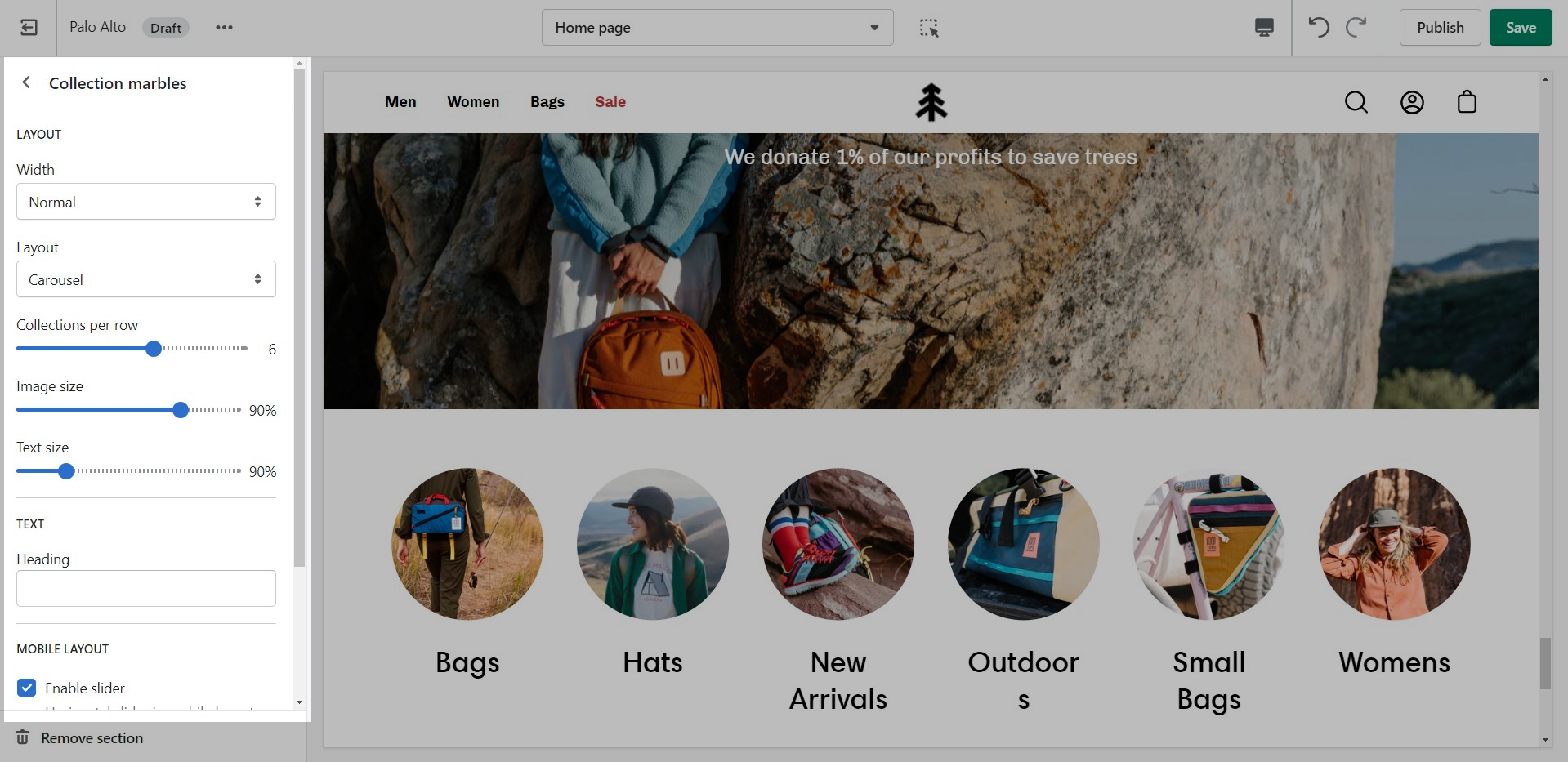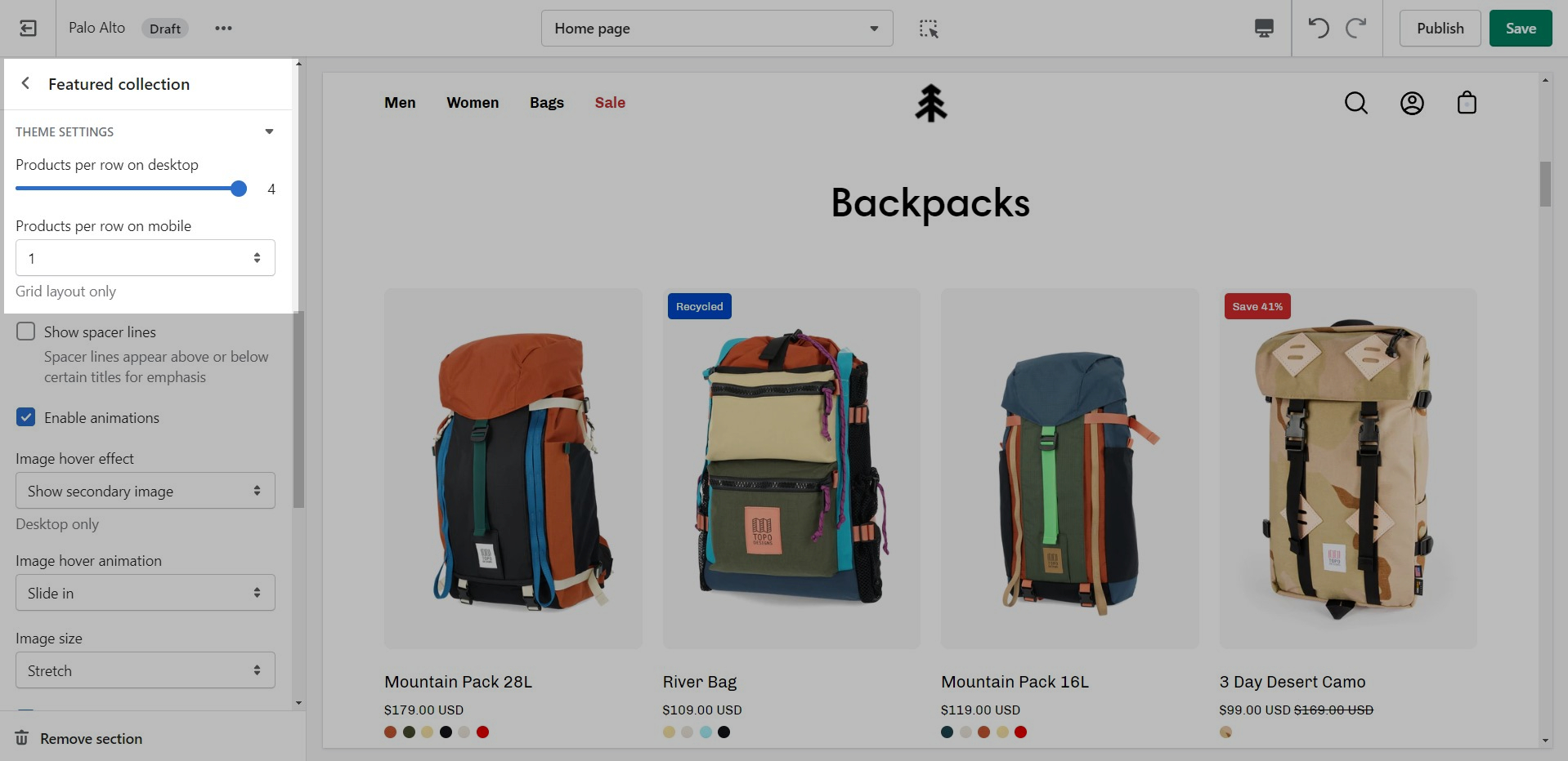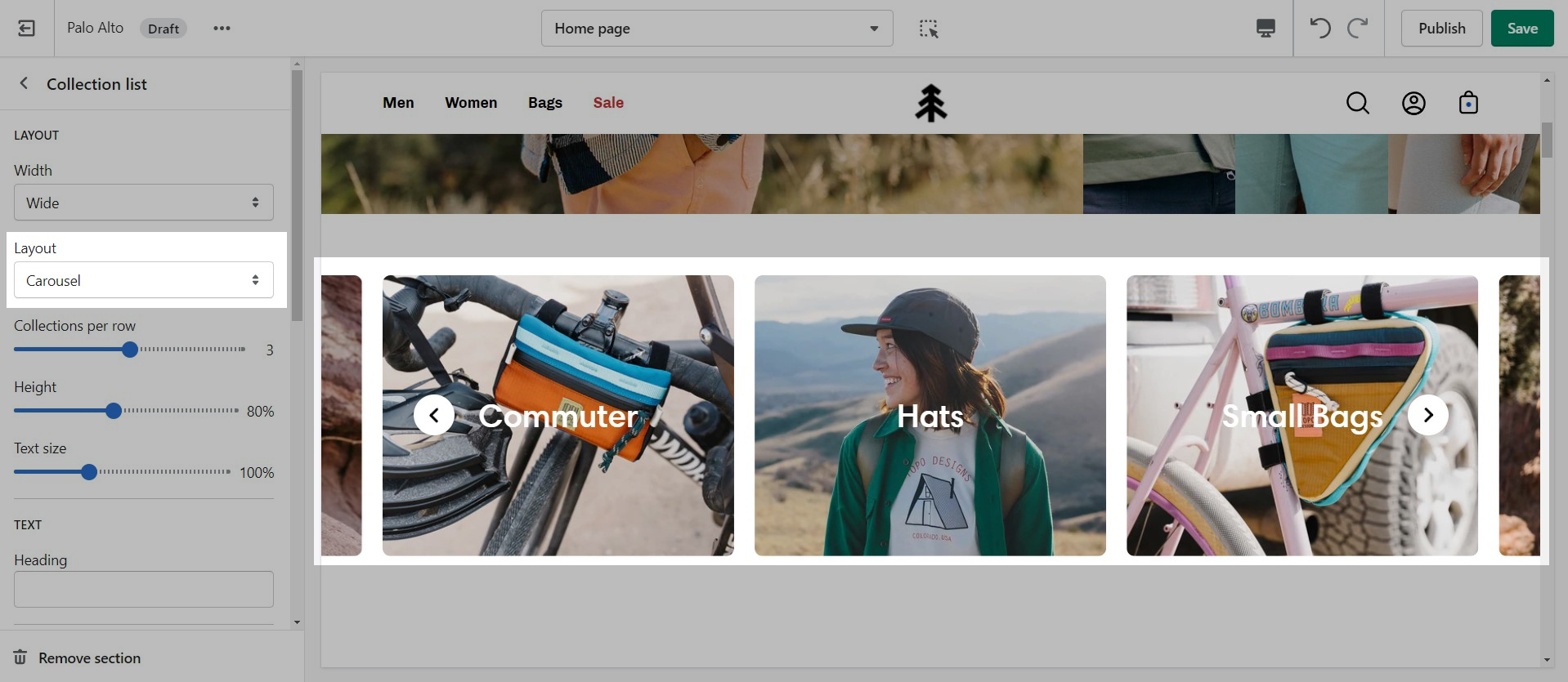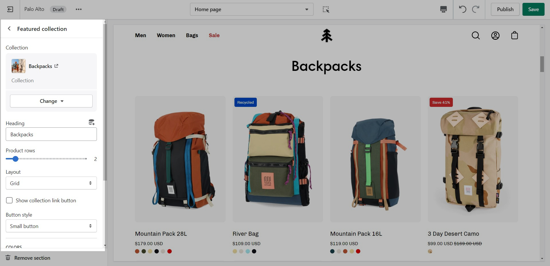 From the settings of this section, you can control which collection to display, the number of rows, as well as a handful of other settings.
