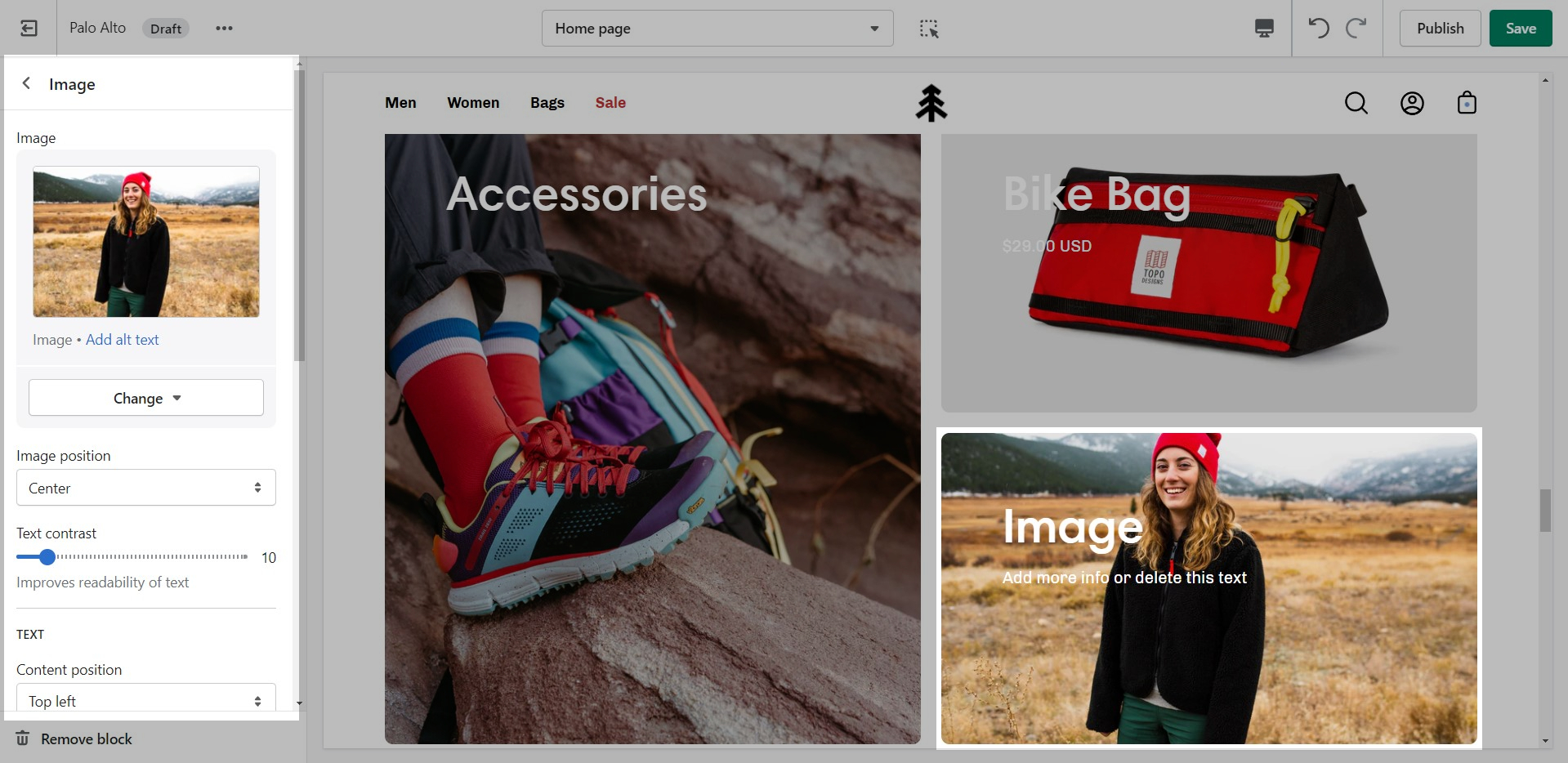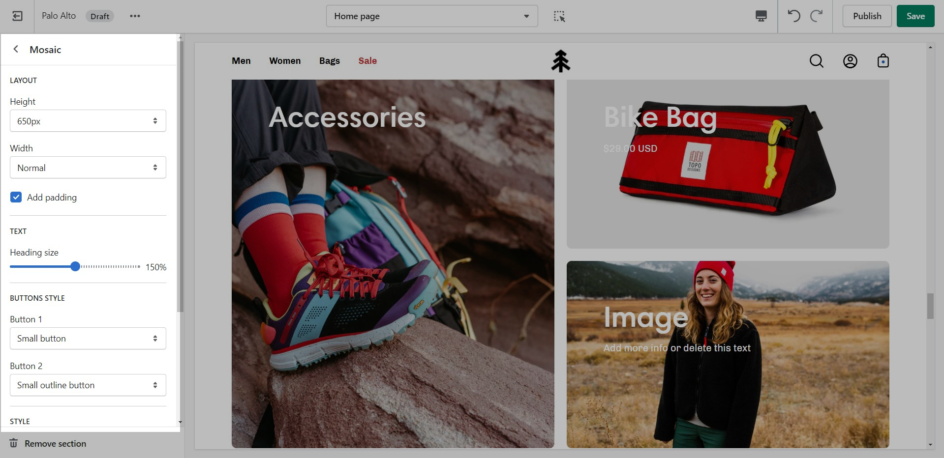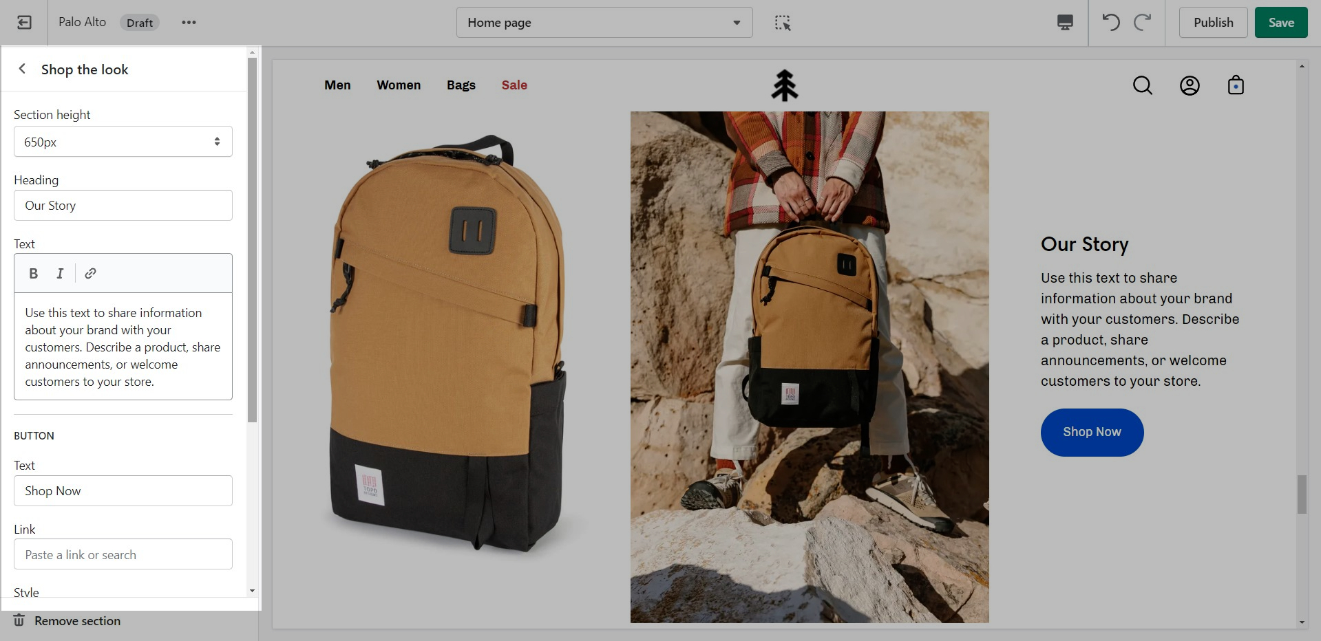 'Shop the look' allows you to use images and dots to highlight specific points of your products. Use this section to create a unique way of getting your customer's attention!