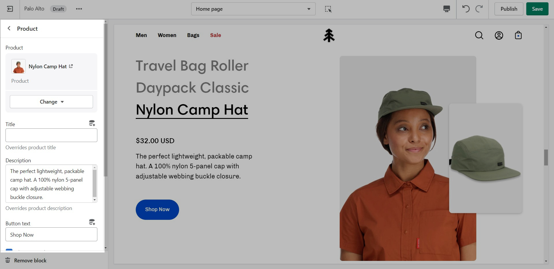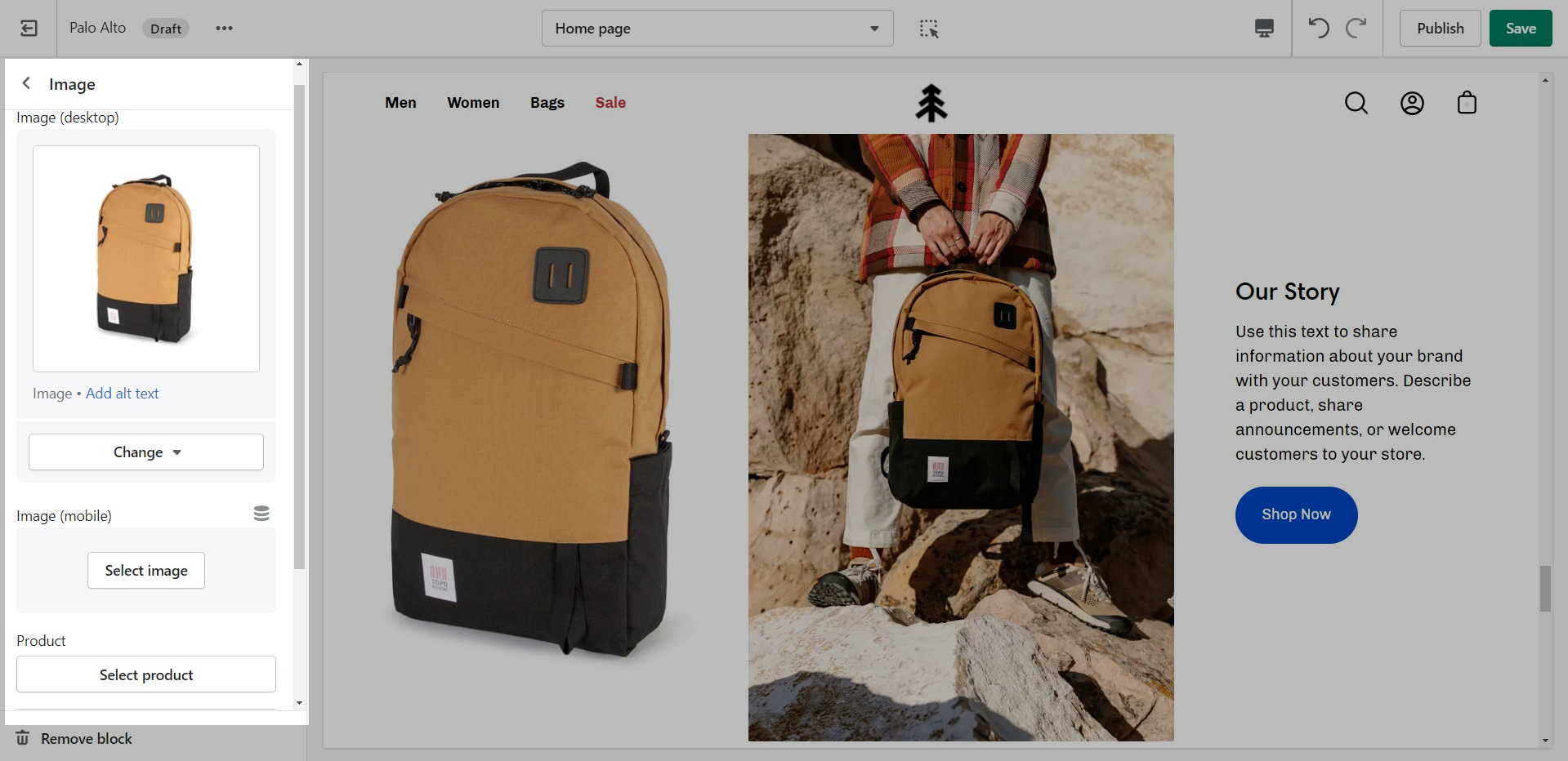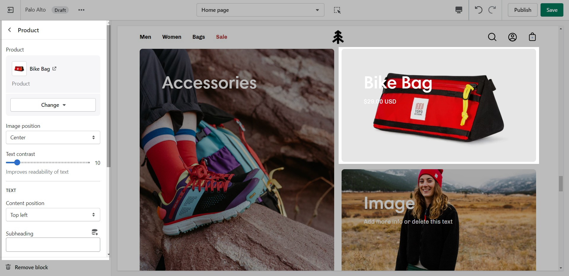 'Shop the look' allows you to use images and dots to highlight specific points of your products. Use this section to create a unique way of getting your customer's attention!
