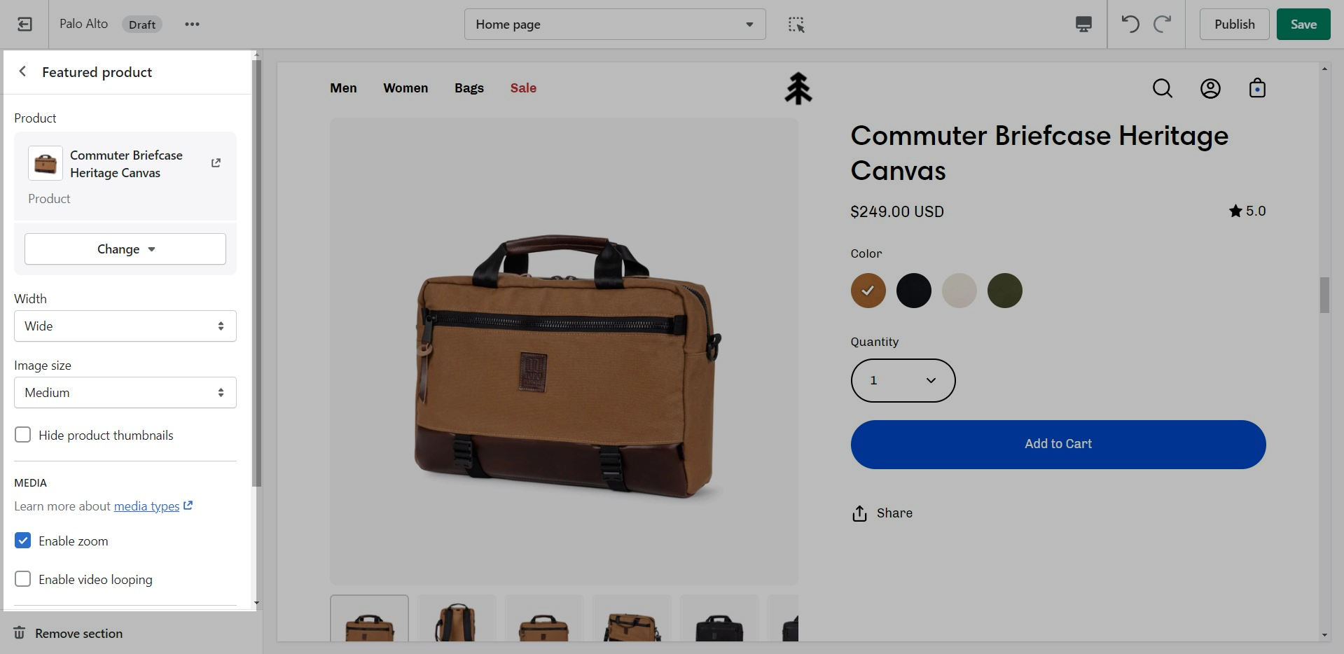 Use the 'Featured product' section to bring a product gallery and form to your store pages.