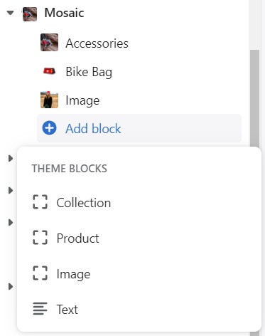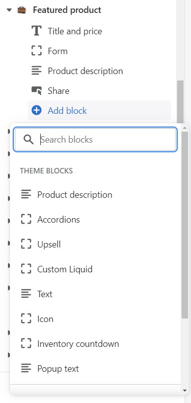 Add blocks by clicking on the small arrow next to the section then clicking 'Add block'.