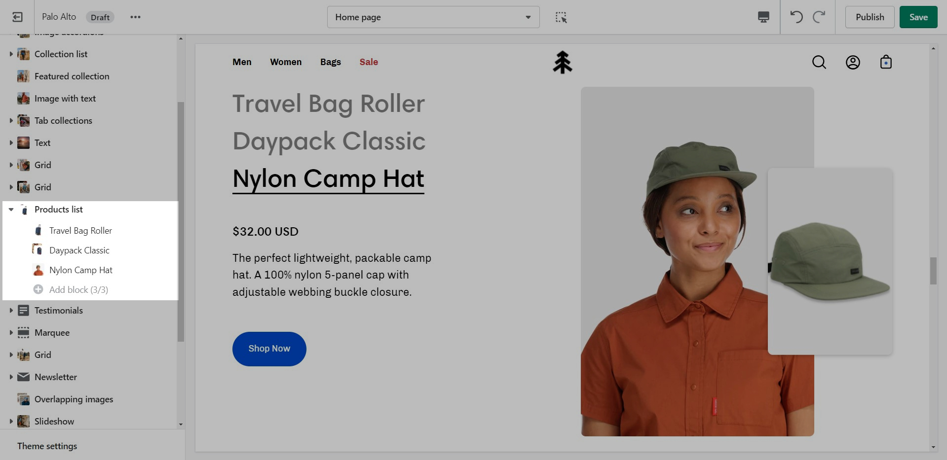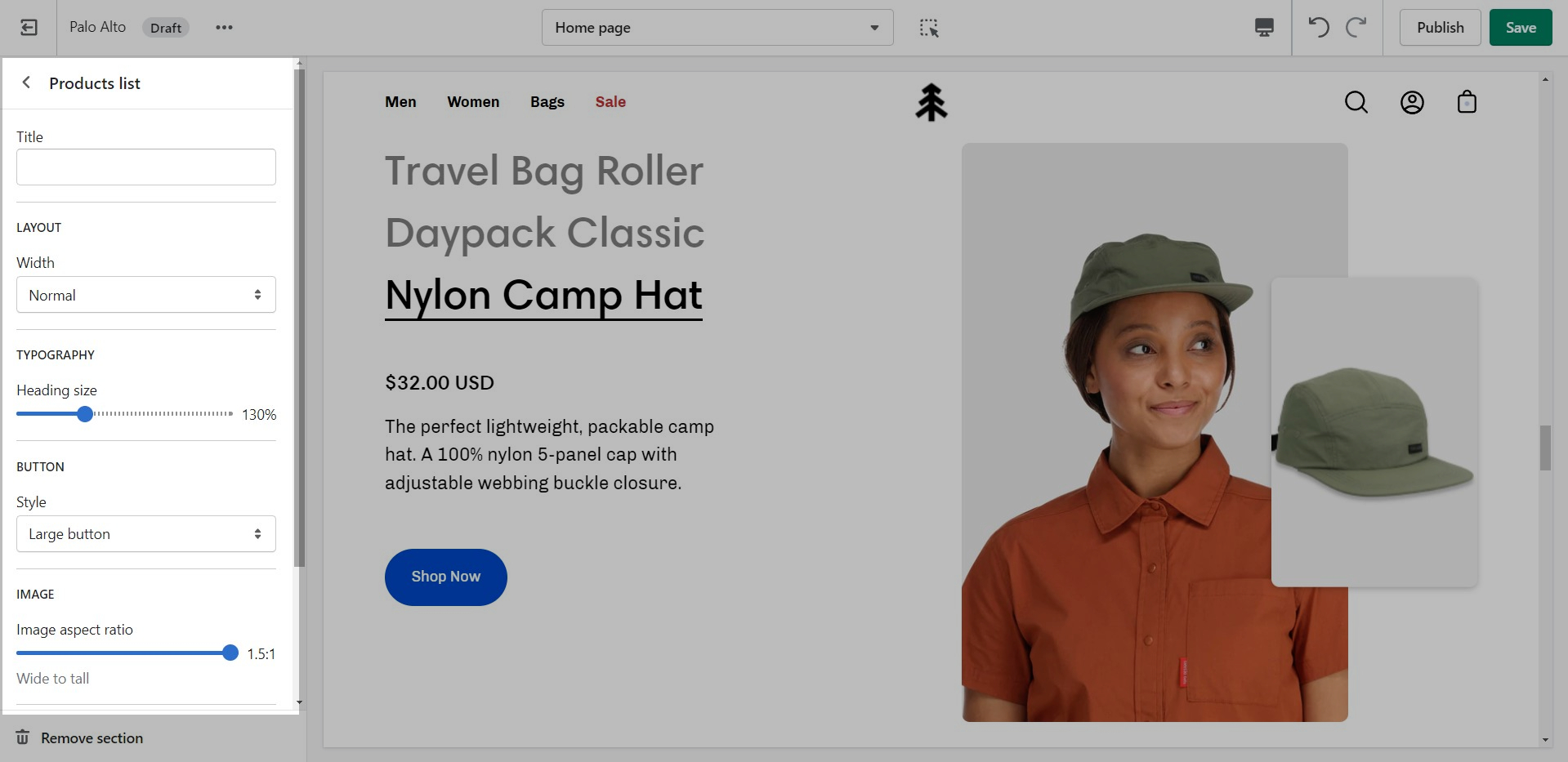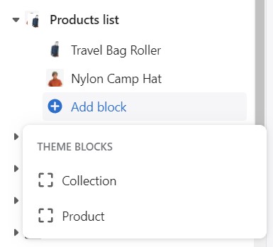 The 'Products list' section creates a split view of text and images. This section can show products or collections.