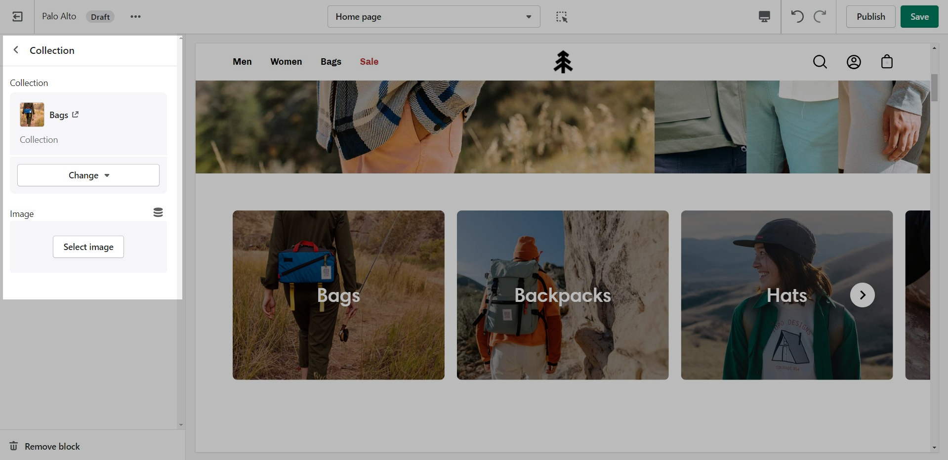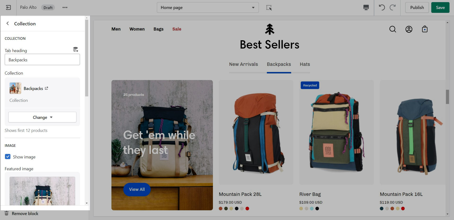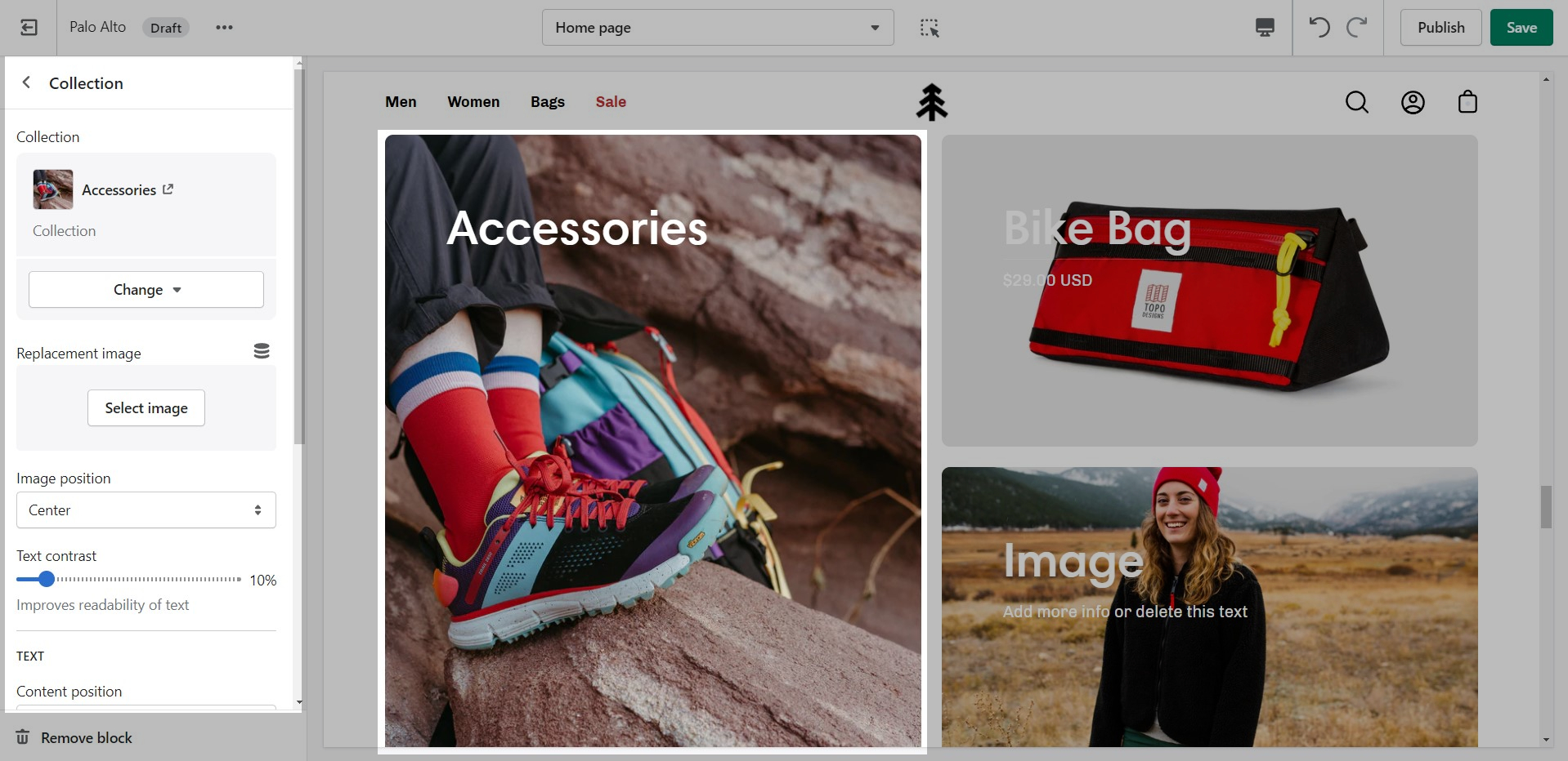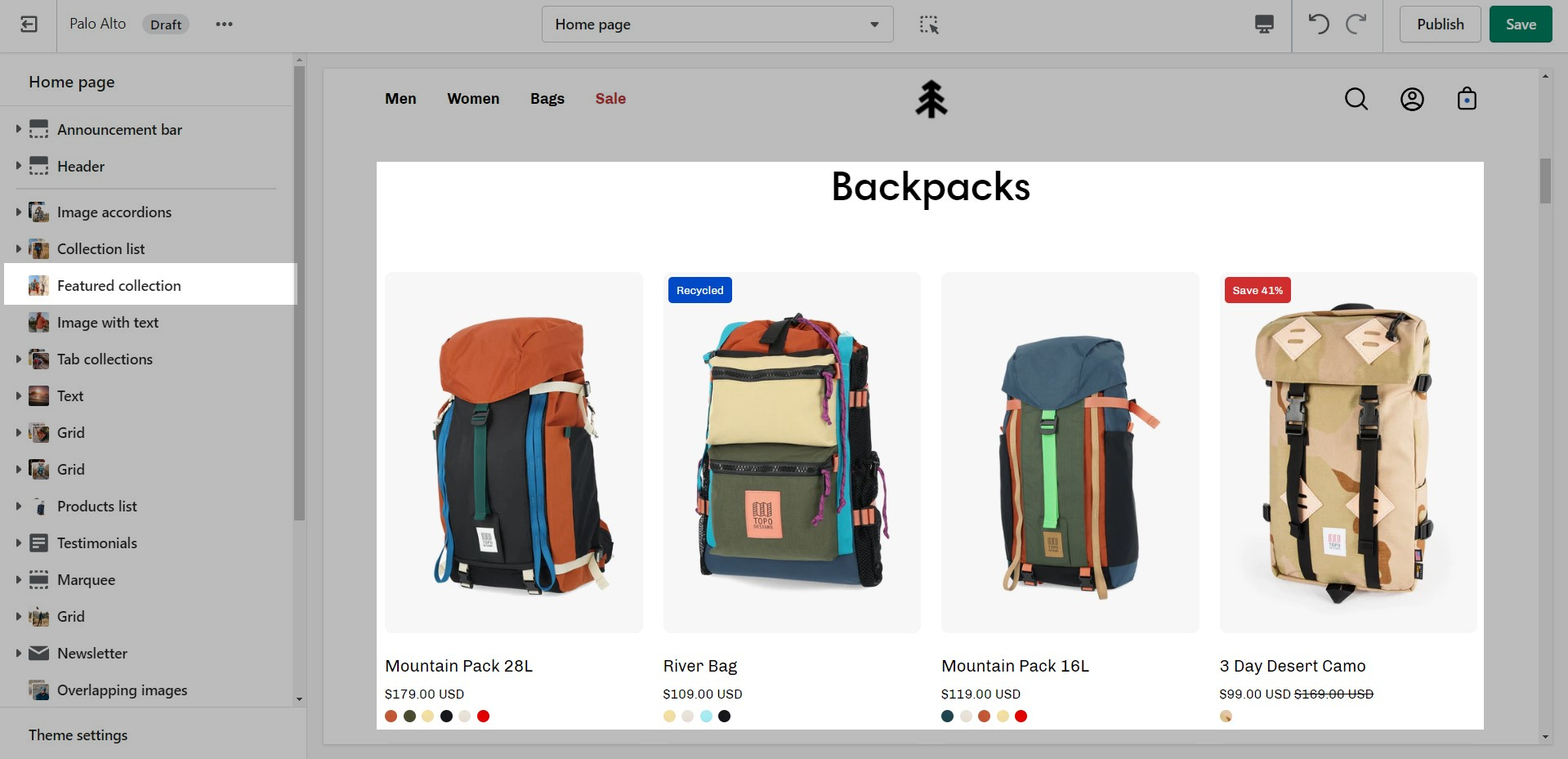 The 'Featured collection' section allows you to highlight a specific collection of products on your store pages. This section generates blocks with links to each product page.