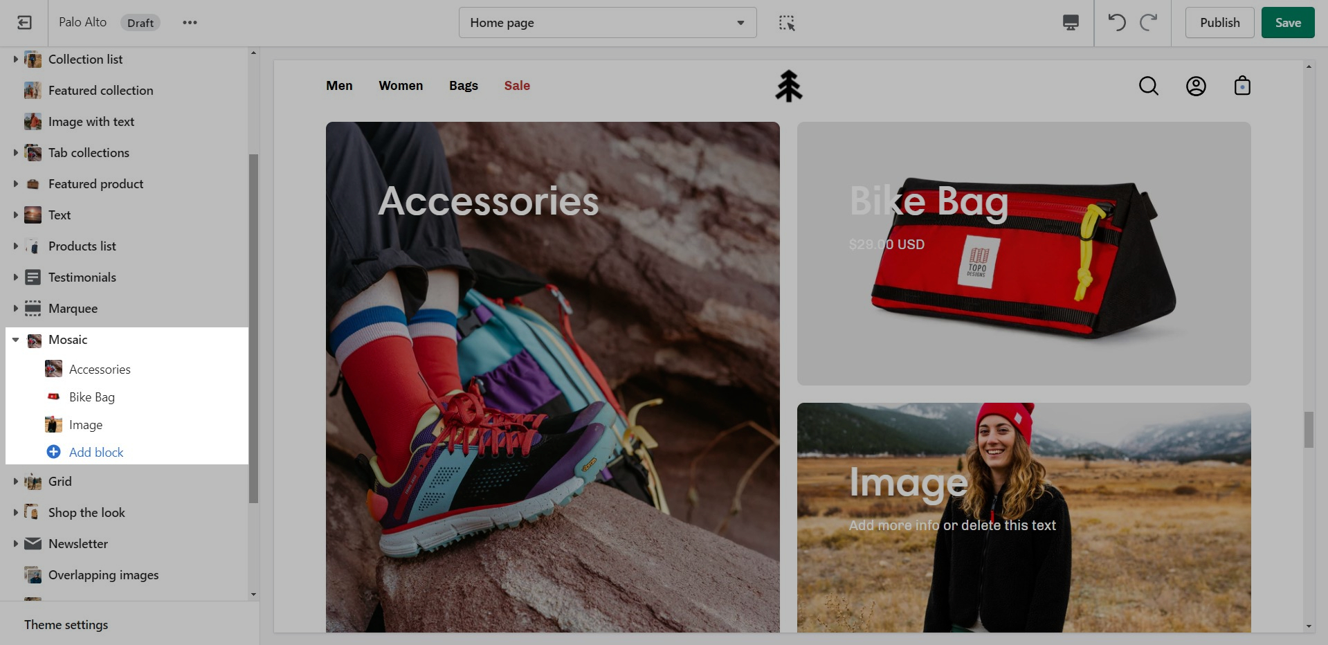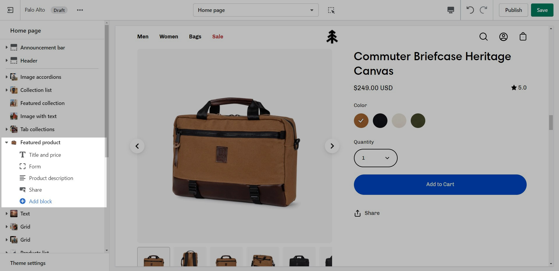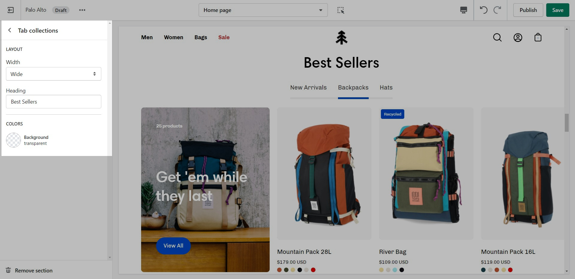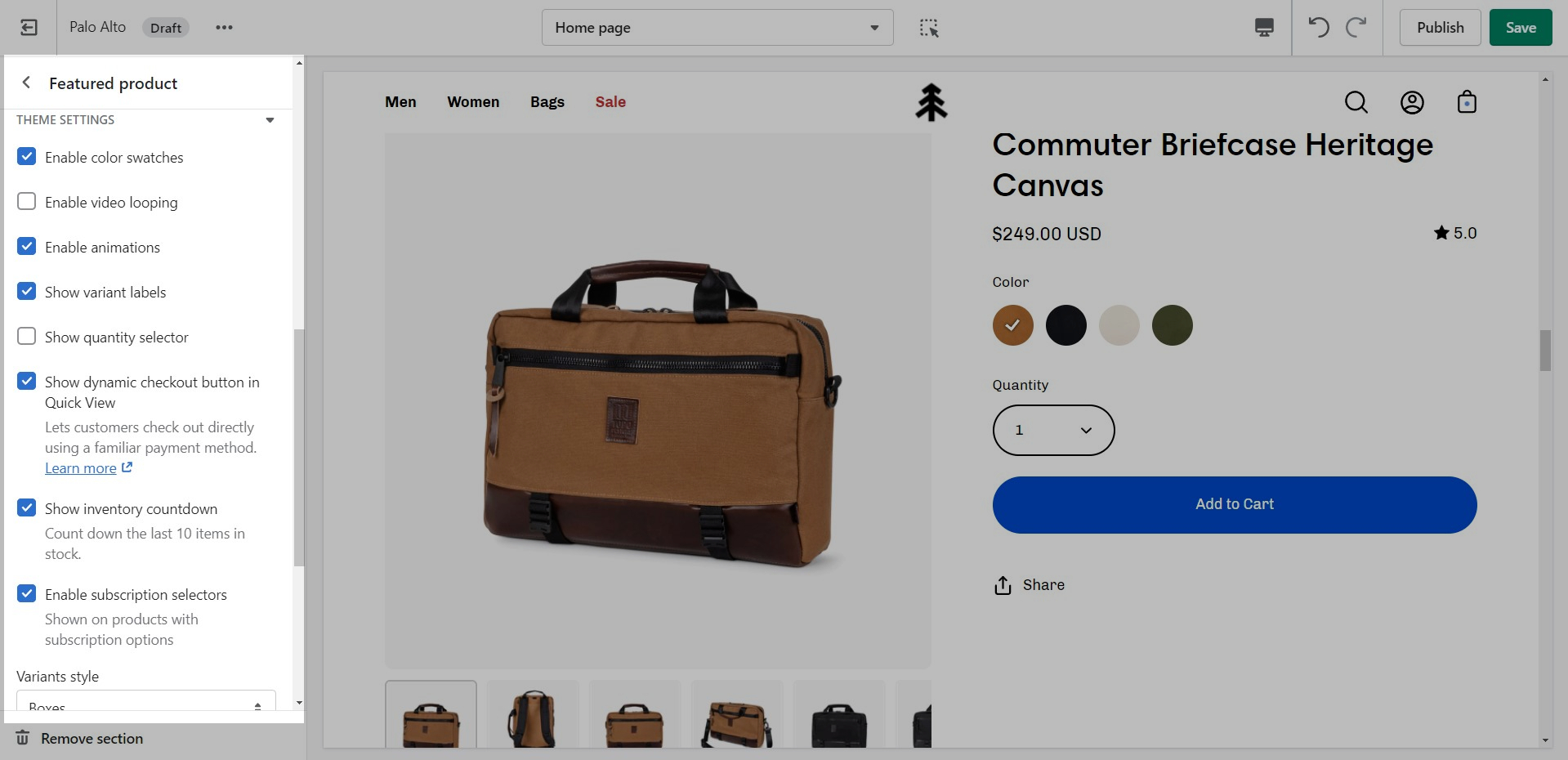 The 'Featured collection' section allows you to highlight a specific collection of products on your store pages. This section generates blocks with links to each product page.