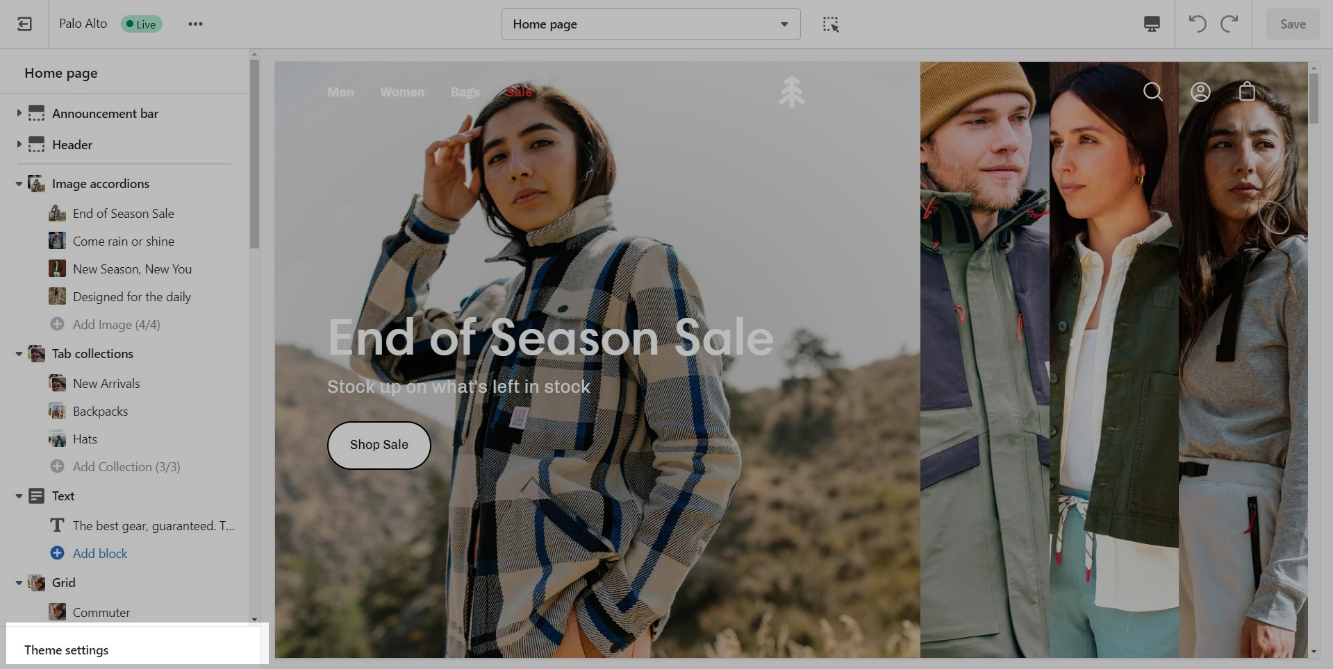 The 'Theme Settings' tab is located under all sections in the Theme Editor. This tab contains a bundle of all global settings in Palo Alto.