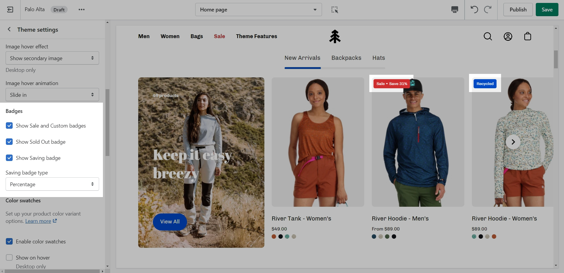 Under **Badges**, you can toggle the Sale, Custom, Sold out, and Savings badges. There is also the option to show savings in cash or as a percentage.