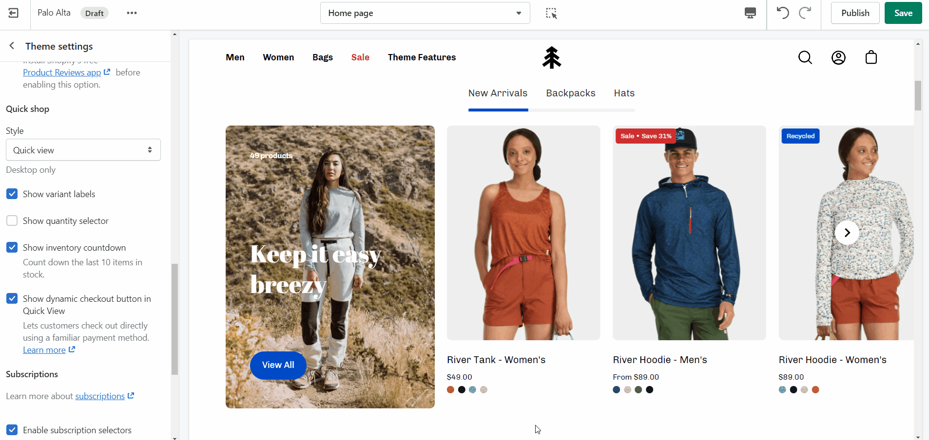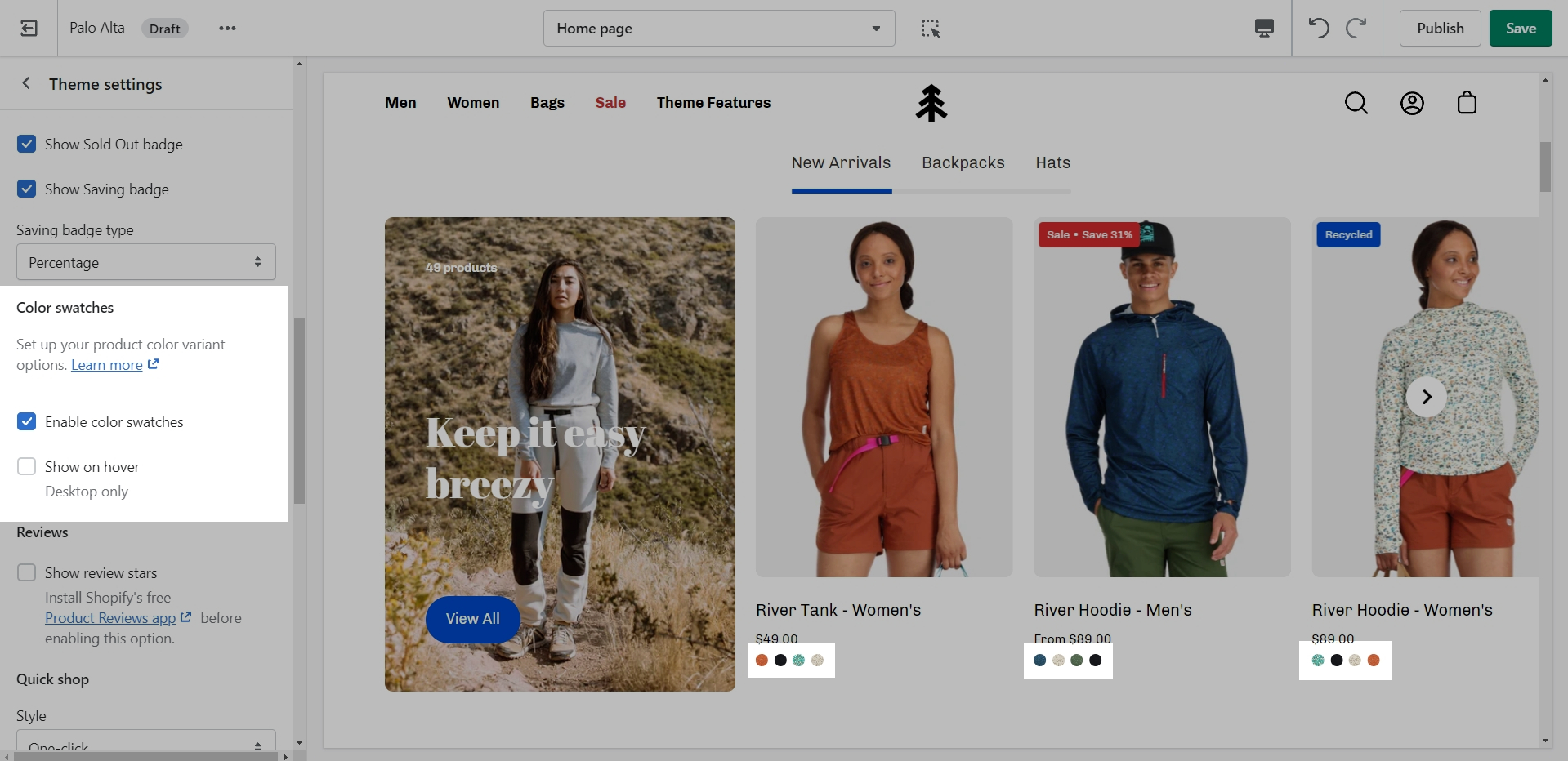 Under **Swatches**, you can toggle color swatches and enable them to be shown on hover (on Desktop only).