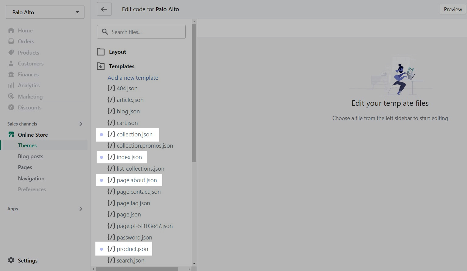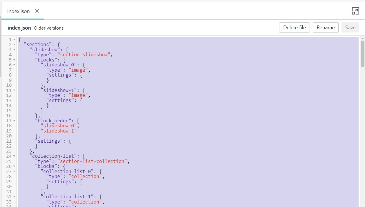 What you can do here is to open up the edited page templates, we'll use index.json for our example, and copy the content to paste in the new theme.