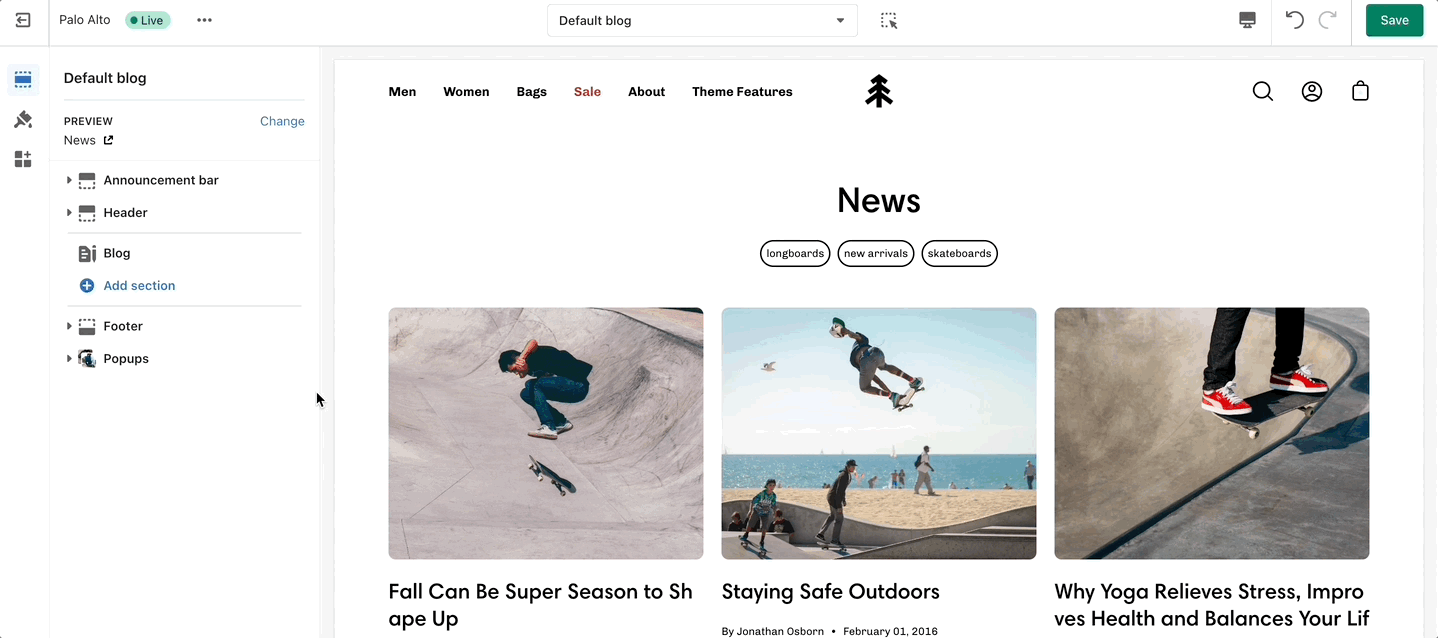 The last step is to assign the new template to one of your blogs so that it can take the new style you've created. This is done by going into your Online Store > Blog posts and clicking on Manage blogs. Once you've found the blog you're looking to change, simply change the template name from the 'Theme template' tab.