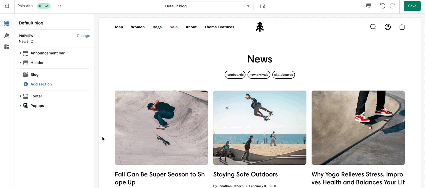 Find your new template by going into the same Blogs tab in the top drop-down menu and select the template you just created. You are now able to add sections to it without affecting any other blog template.