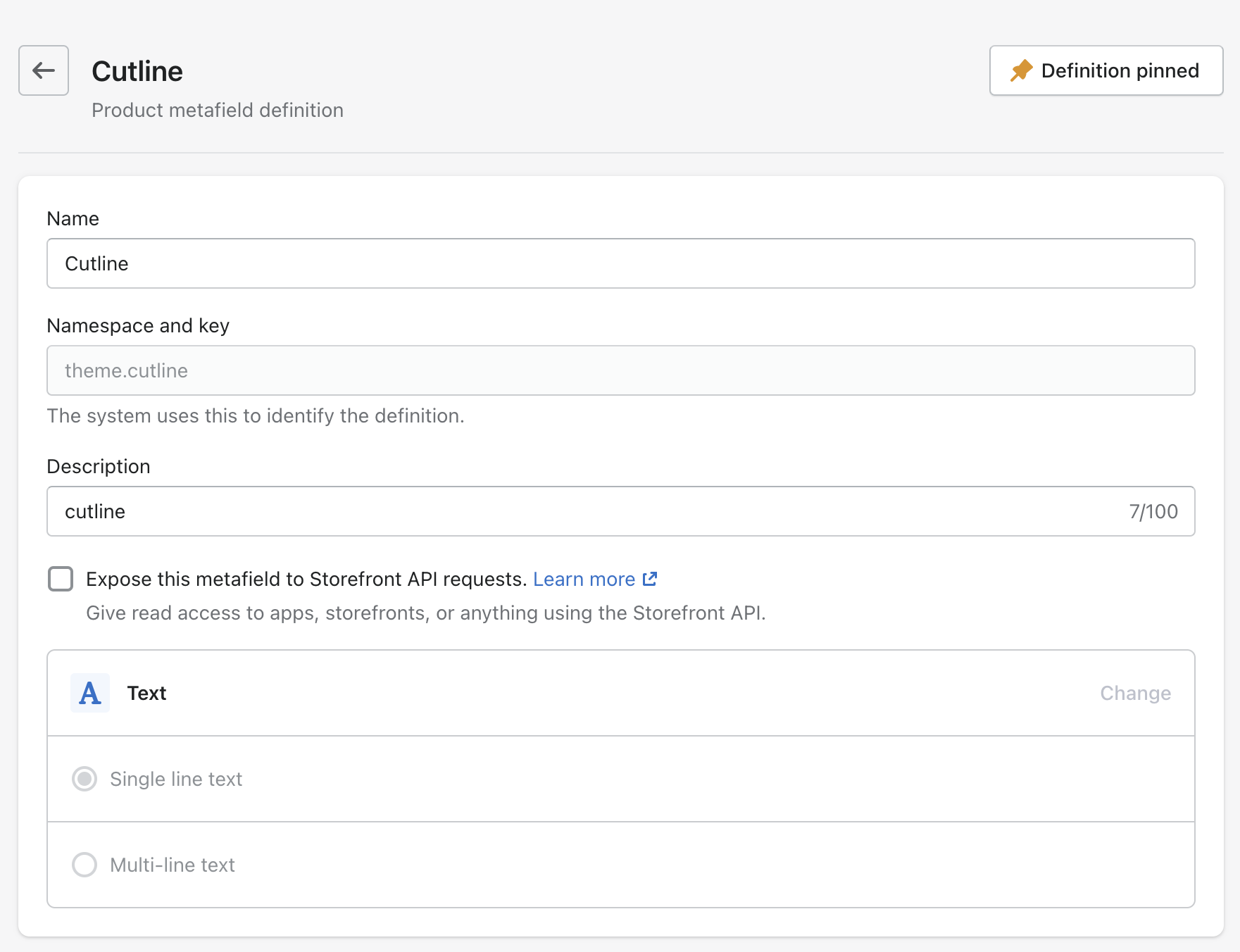 Now that our custom metafield has been defined, the final step is to edit any of your products in the Shopify Admin -> Products and update the new cutline metafield.
