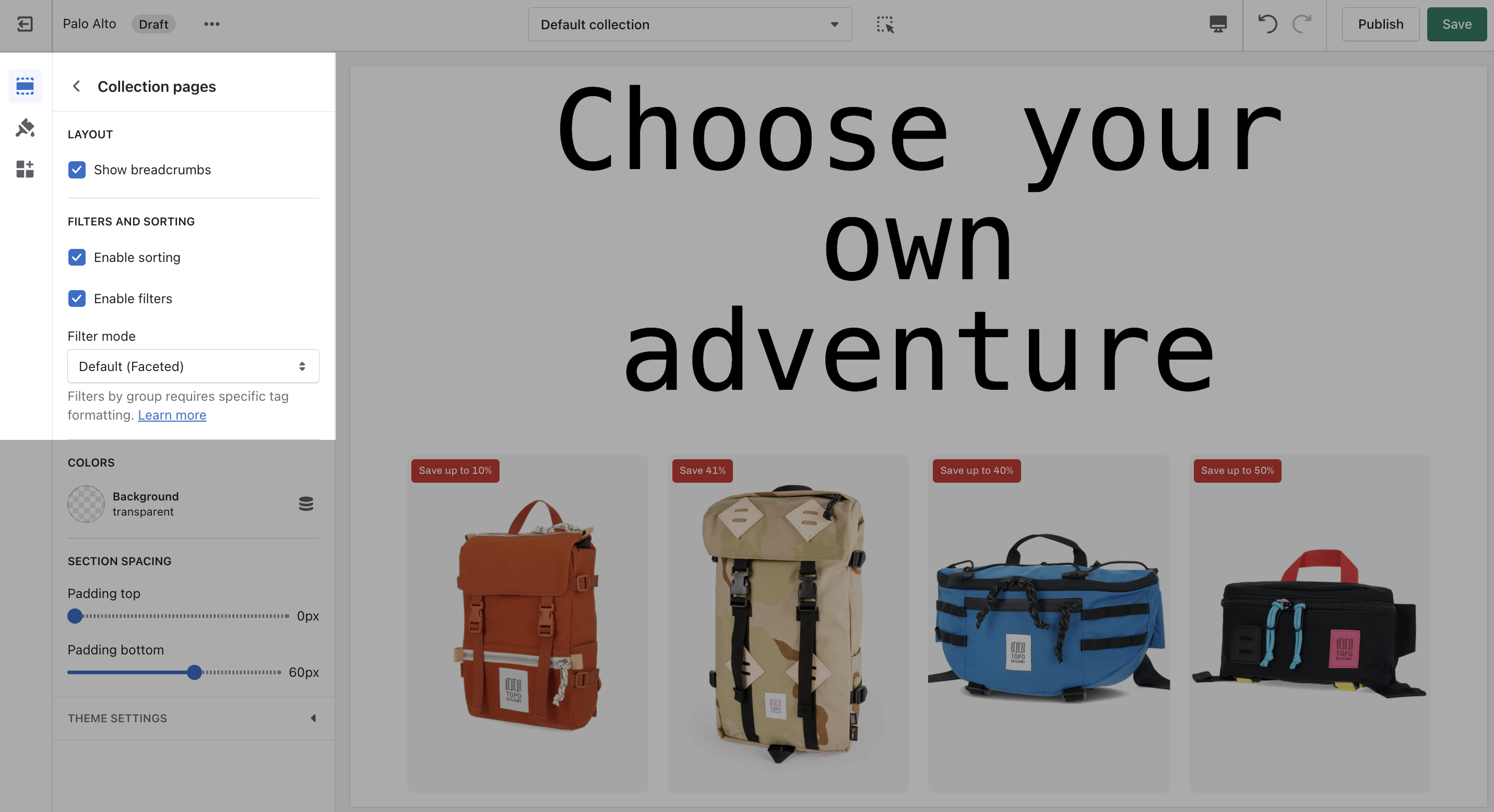 Palo Alto has three filtering methods to choose from. They can be found under the Collection products section settings.