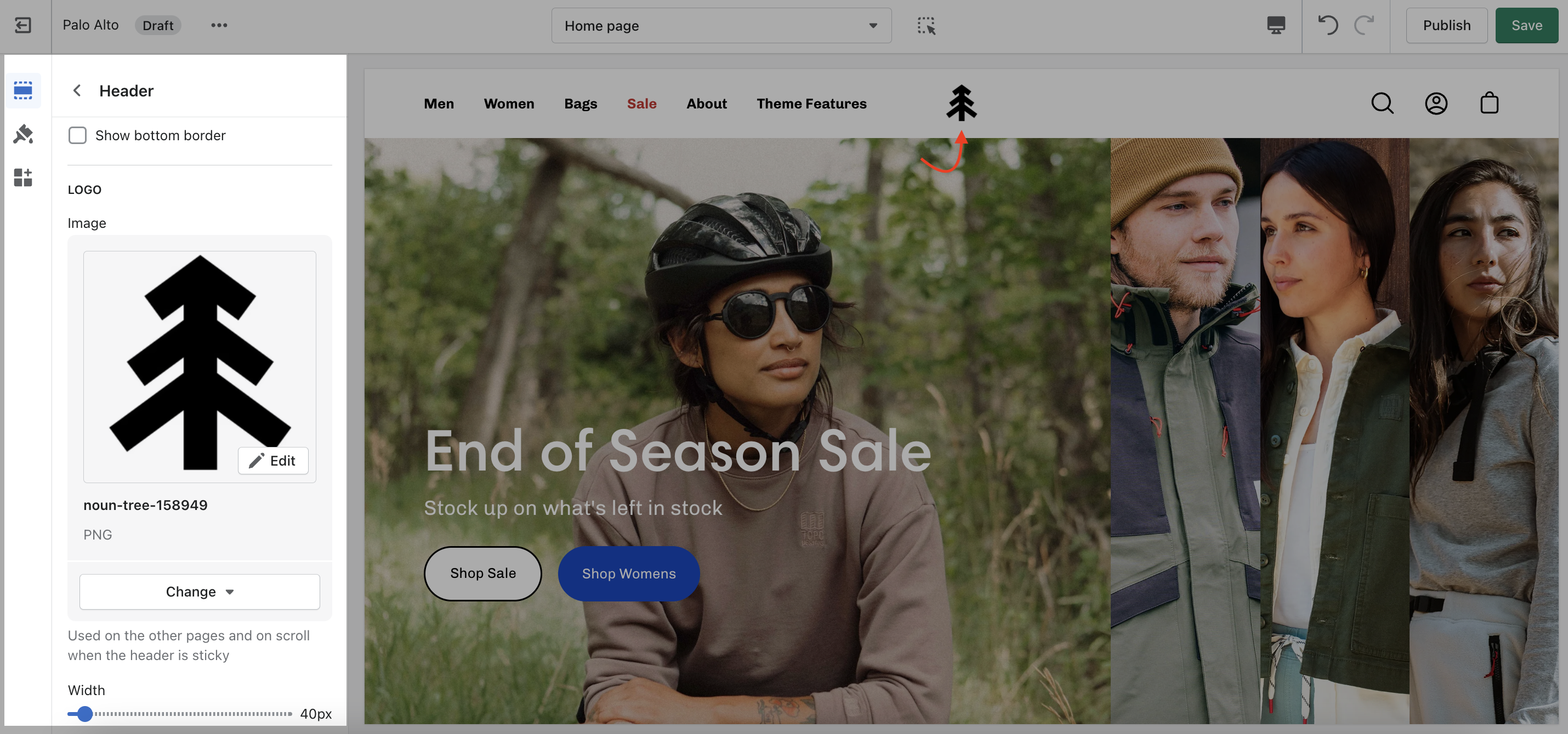 You can upload a logo in place of your store name by opening the Header section settings and uploading a **Custom logo**: