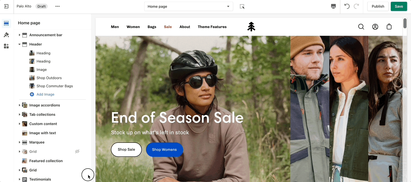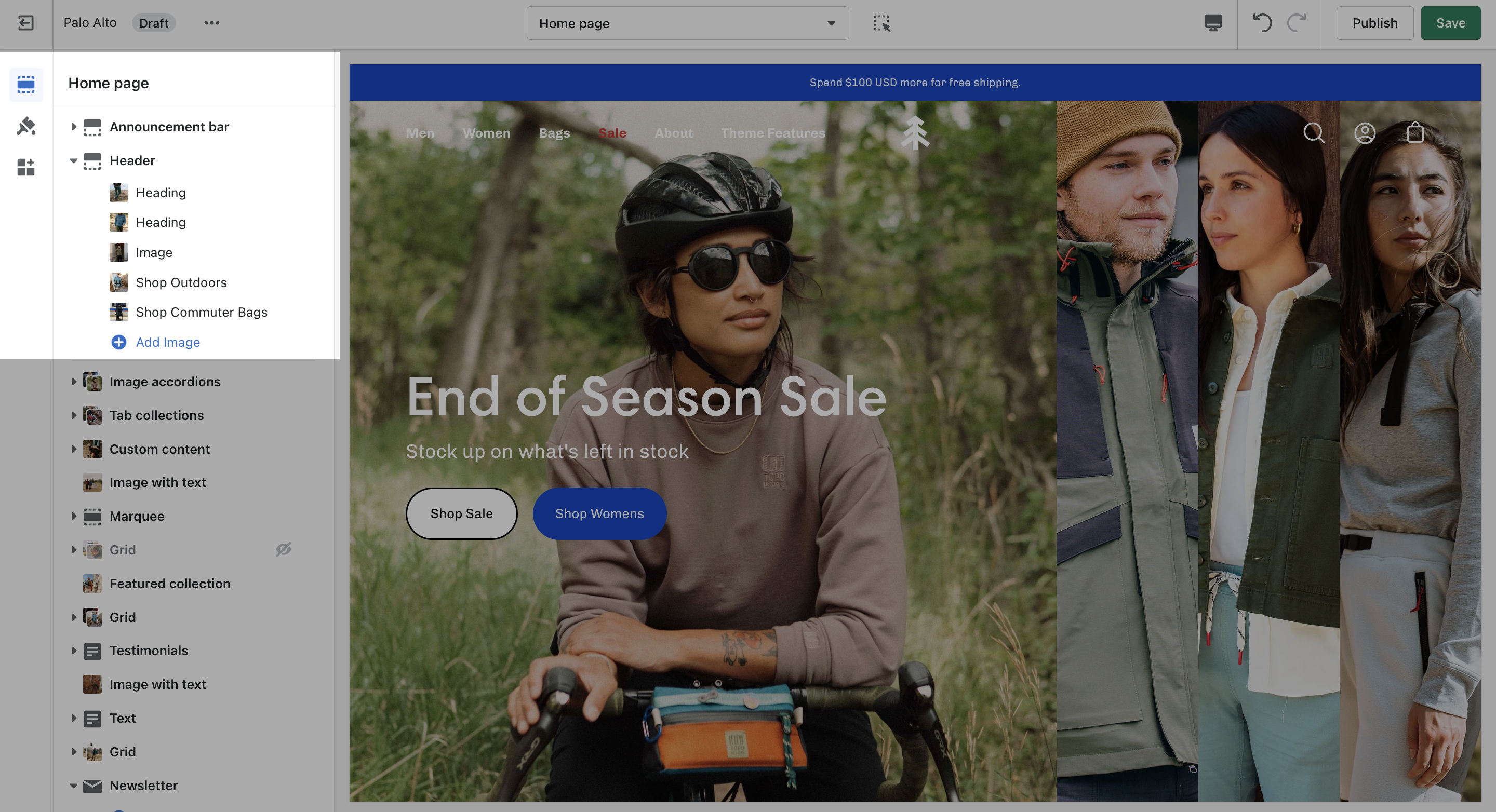 Palo Alto can display a transparent header on the homepage, collection pages, and any customized pages that include a fullwidth background image (or video) section.