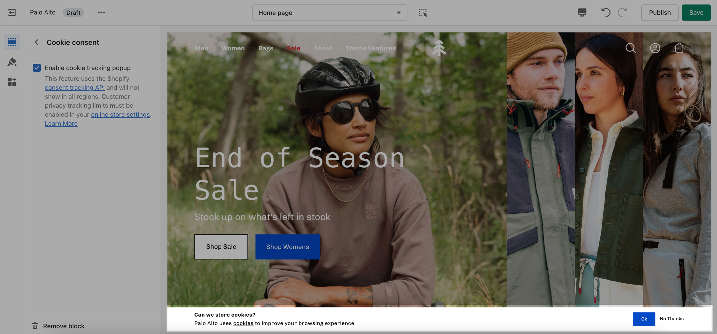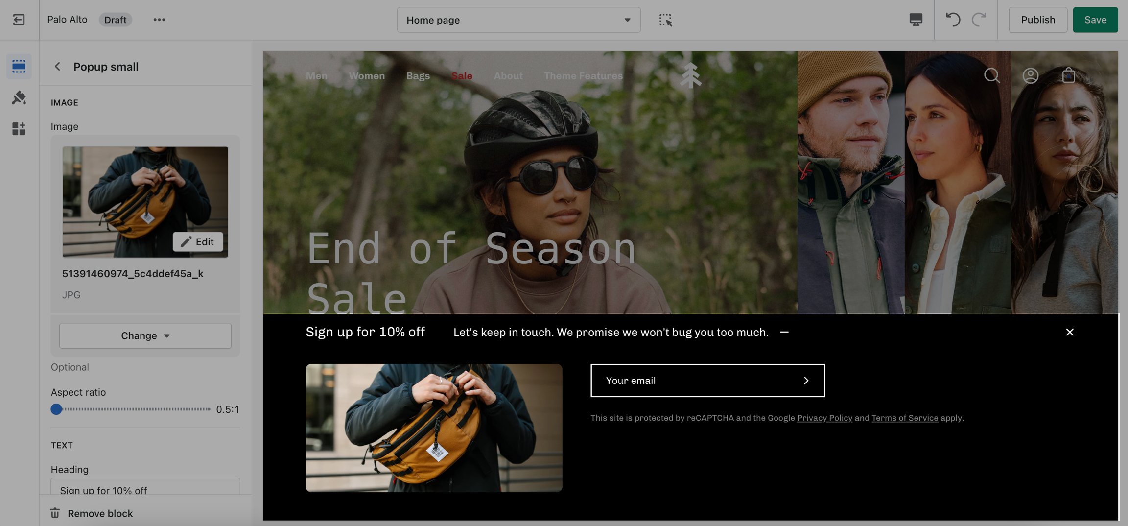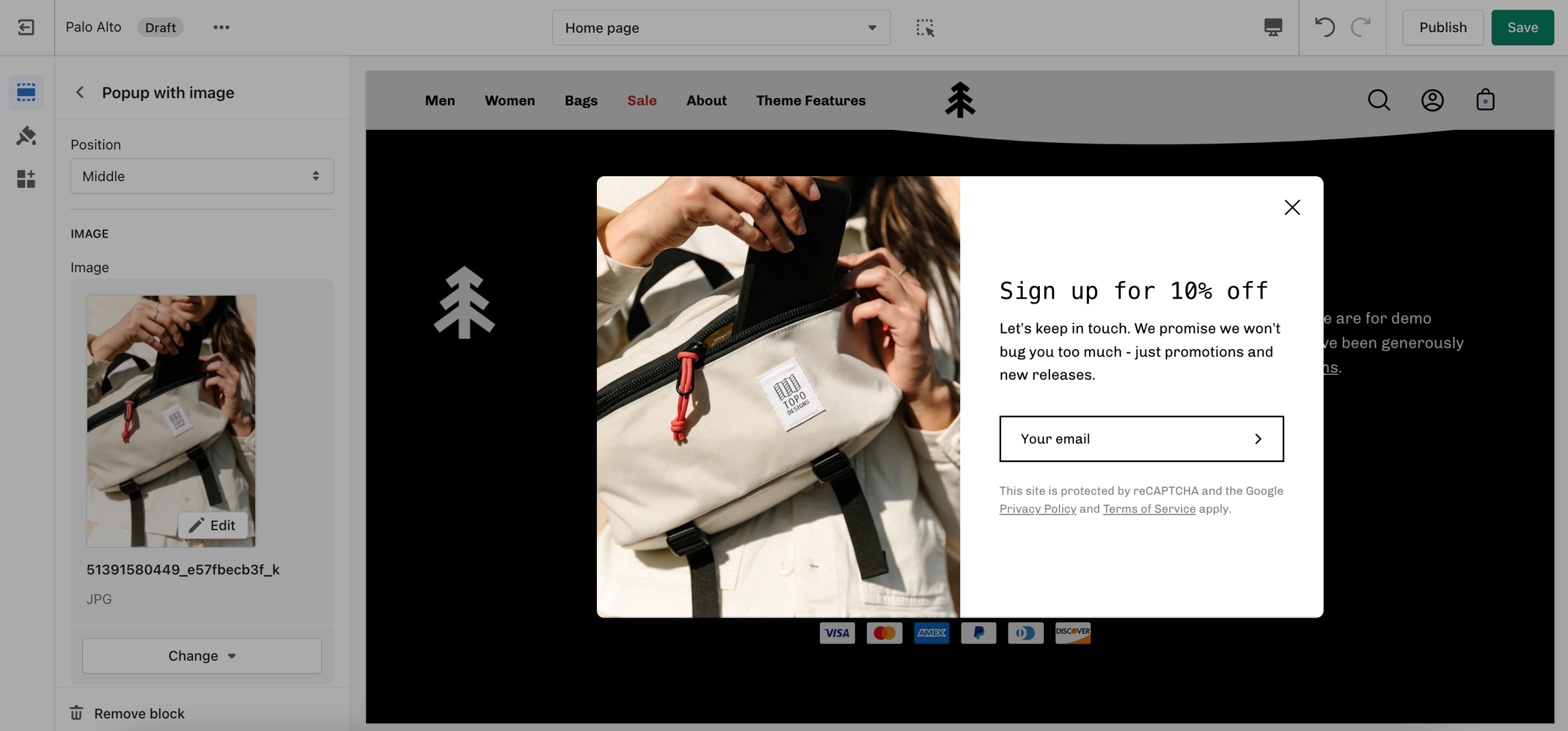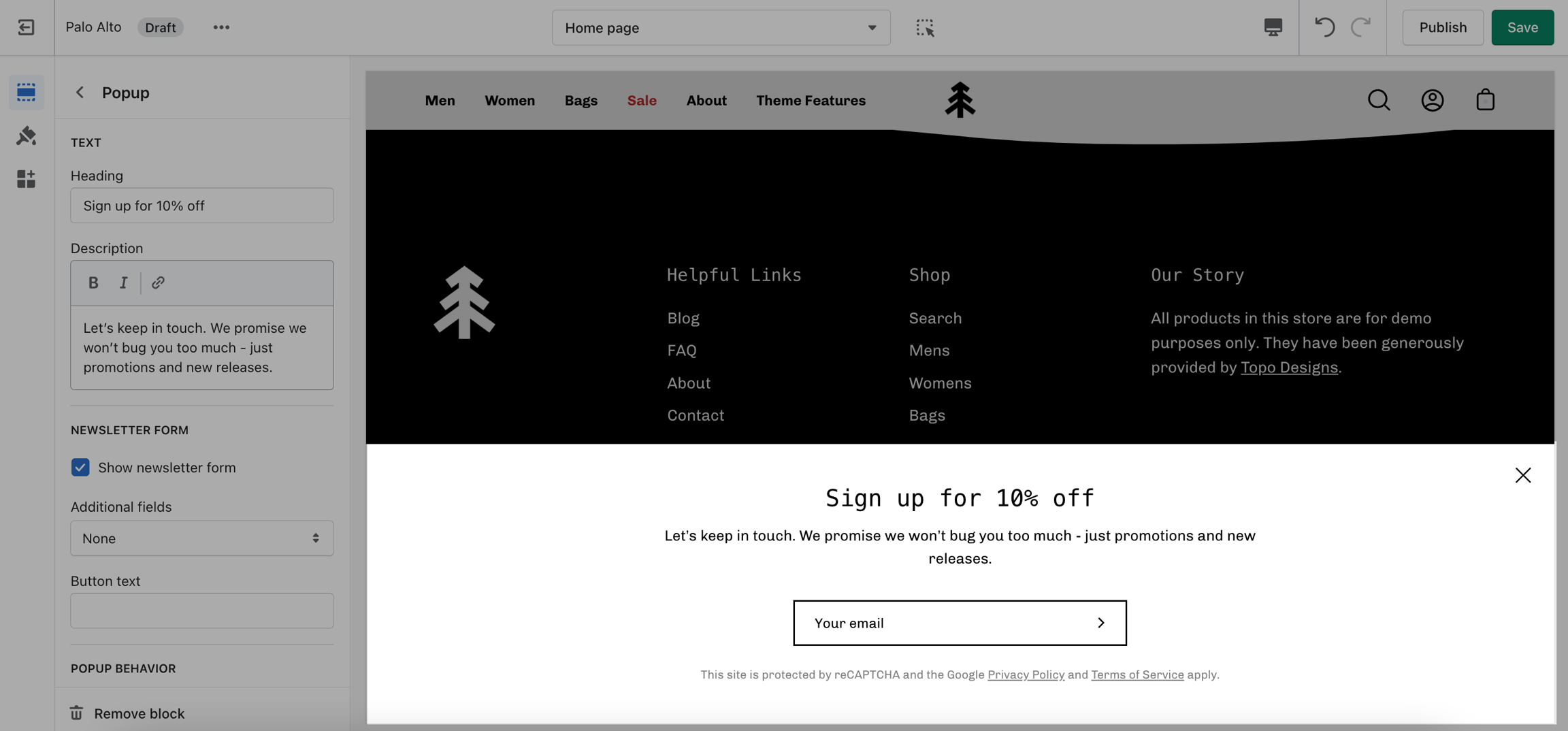 The popup section in Palo Alto can be used as a newsletter popup or as a sales promotion tool to display custom messages and promo codes based on where the customer arrives from, is viewing, and how they are interacting with your site.