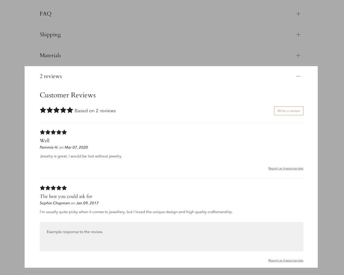 Individual reviews and forms to add a new review can be shown with Palo Alto's accordions or separate below the product description: