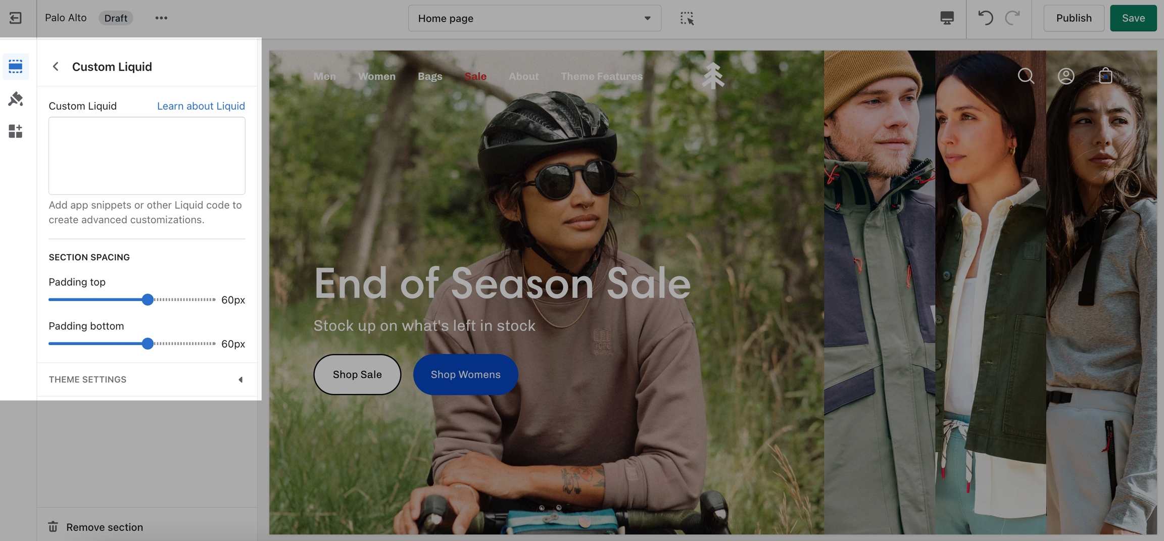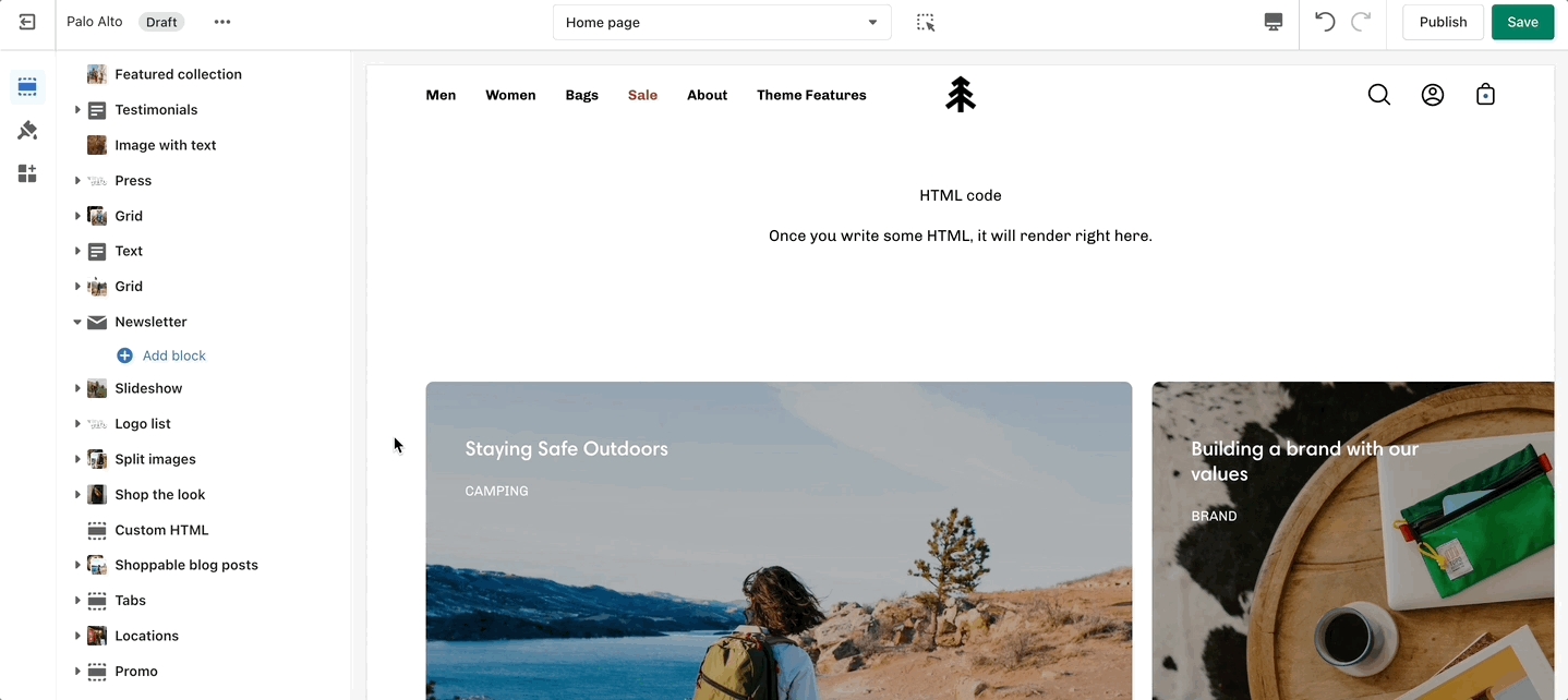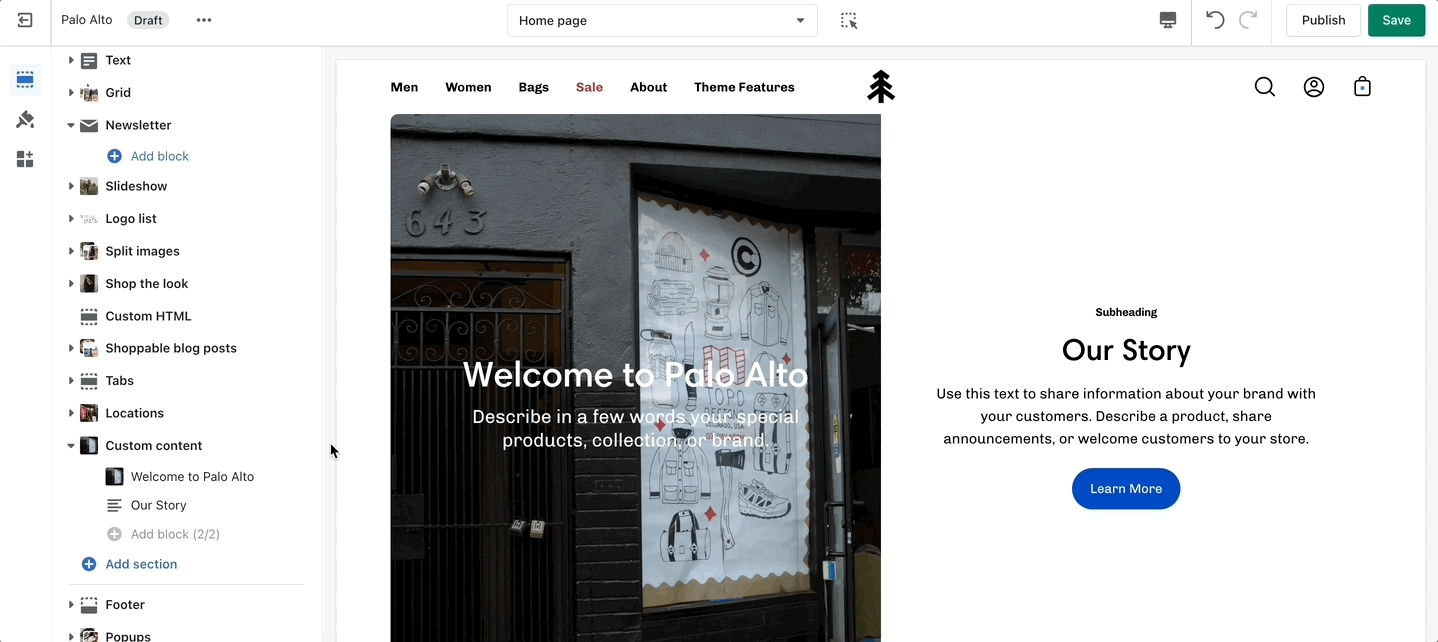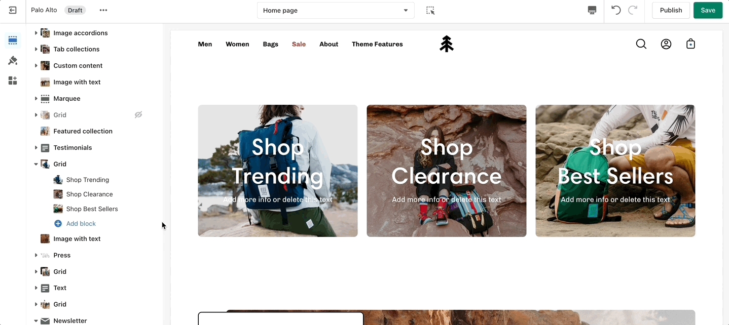 The 'Grid' section allows you to bundle different blocks together to create your own layout. You can add a mix of collections, products, images, and text to make this section your own.