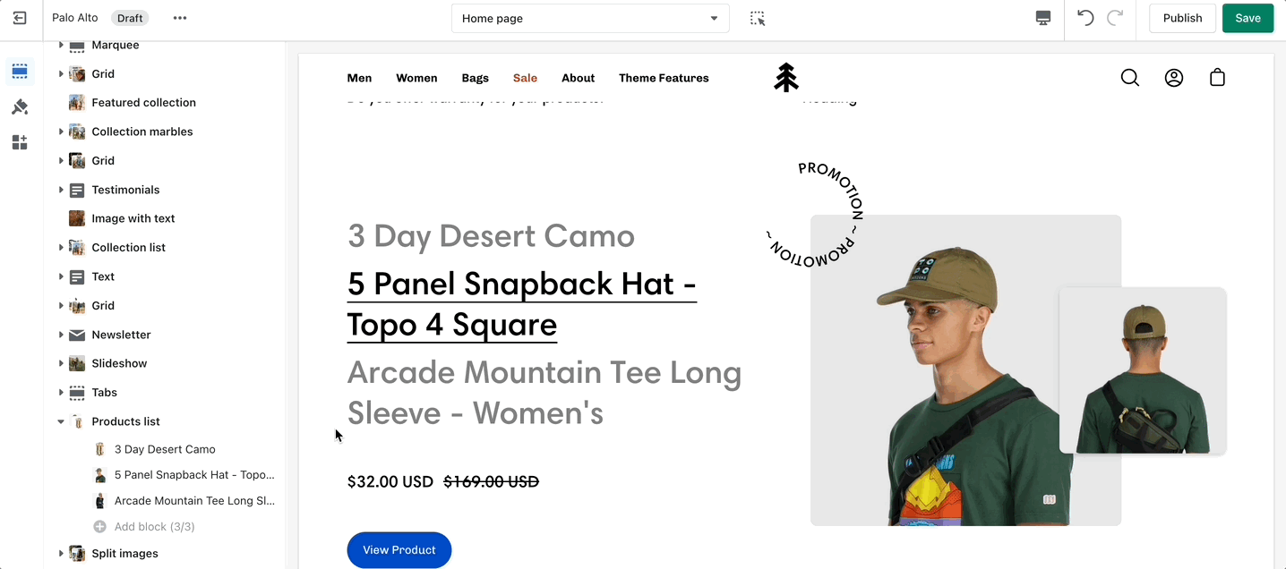 The 'Products list' section creates a split view of text and images. This section can show products or collections.