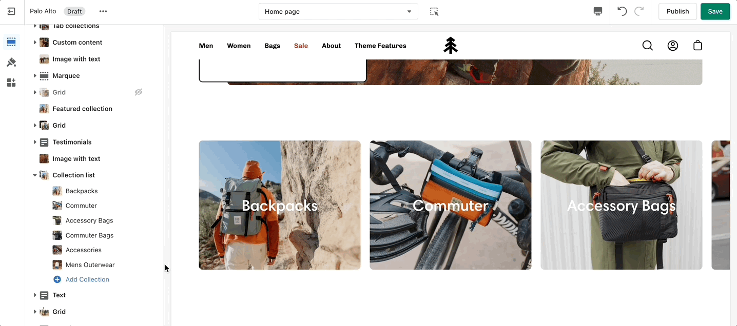 The 'Collection list' section is here to help you add links to collections you want to highlight on your store pages. This is a quick and easy way to run promotions or let your customers know about new collections.