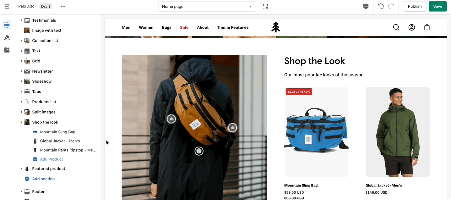 'Shop the look' allows you to use images and dots to highlight specific points of your products. Use this section to create a unique way of getting your customer's attention!