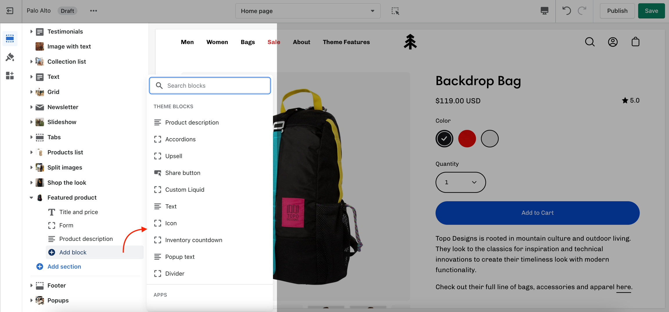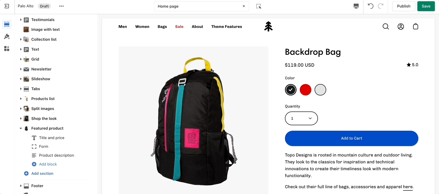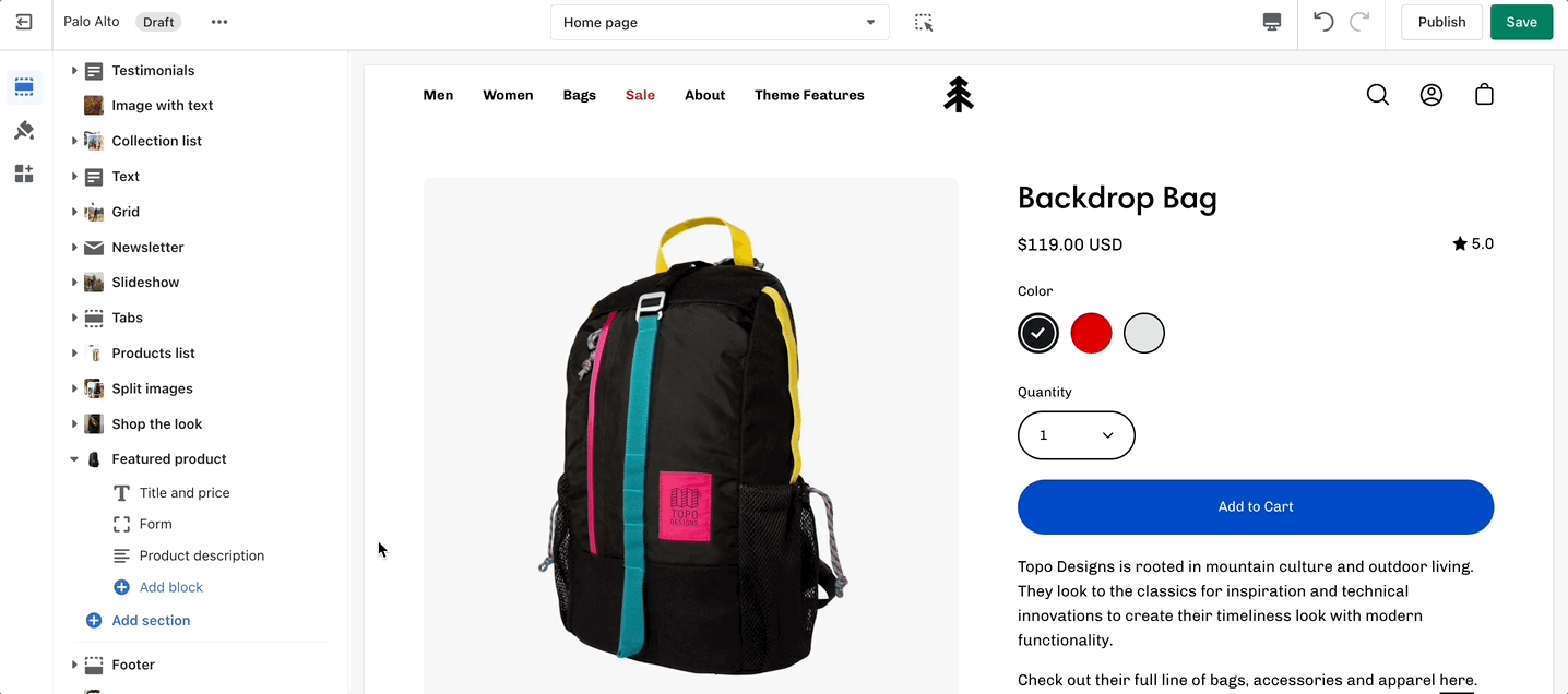The 'Featured collection' section allows you to highlight a specific collection of products on your store pages. This section generates blocks with links to each product page.