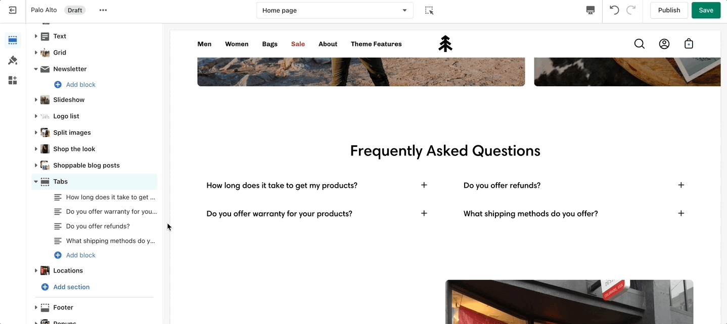 Palo Alto includes a 'Tabs' section to help you provide frequently asked questions. A place to promote your services, and brand strengths and also include product reviews.