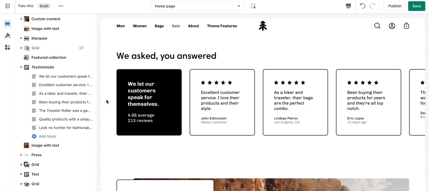 Add a heading and set the colors, alignment, and navigation style of this section. Add individual testimonial blocks to the section.