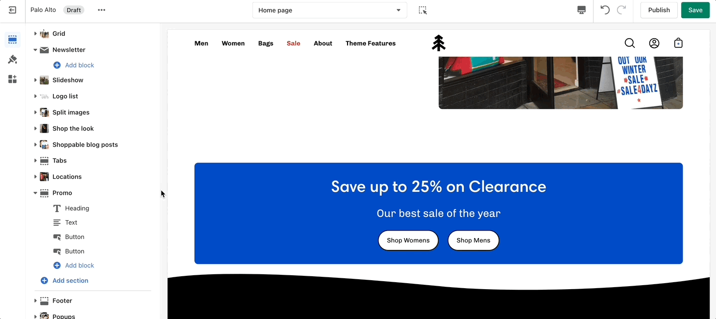 Use the 'Promo' section to add a simple banner image with text and promote to customers as they scroll along the page.